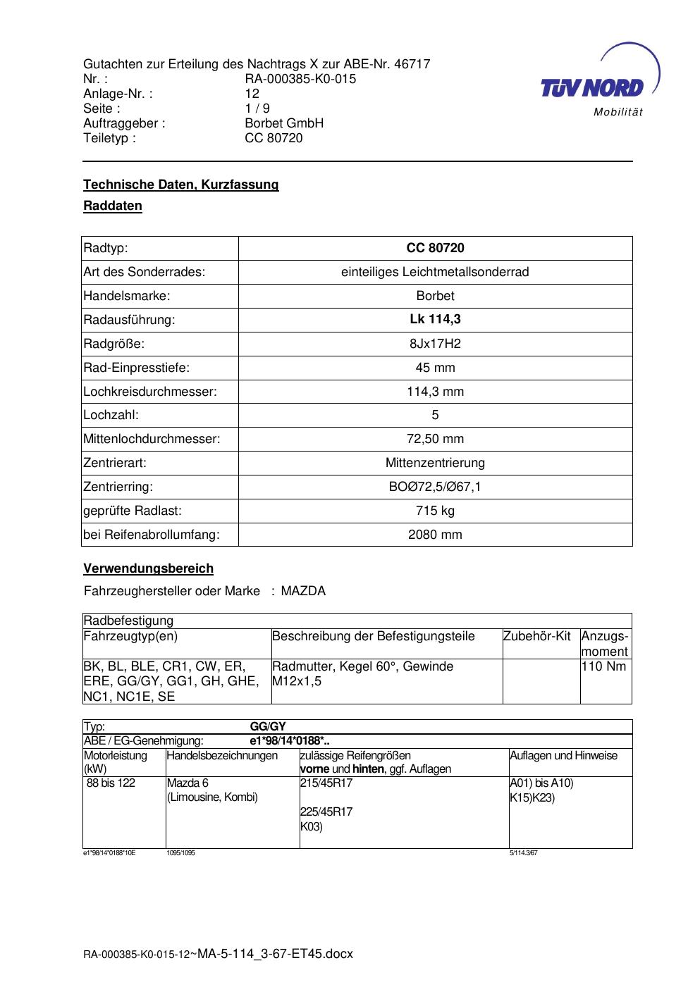 Dieses Gutachten (abe) bezieht sich auf die Alufelge brand-borbet CC 80720 in der Ausführung 8Jx17 ET 0, Mittenloch 0 mm (KBA 46717). Im PDF findest du typischerweise zulässige Reifengrößen, Auflagen/Anbauhinweise und – je nach Dokument – Hinweise zur Eintragung.