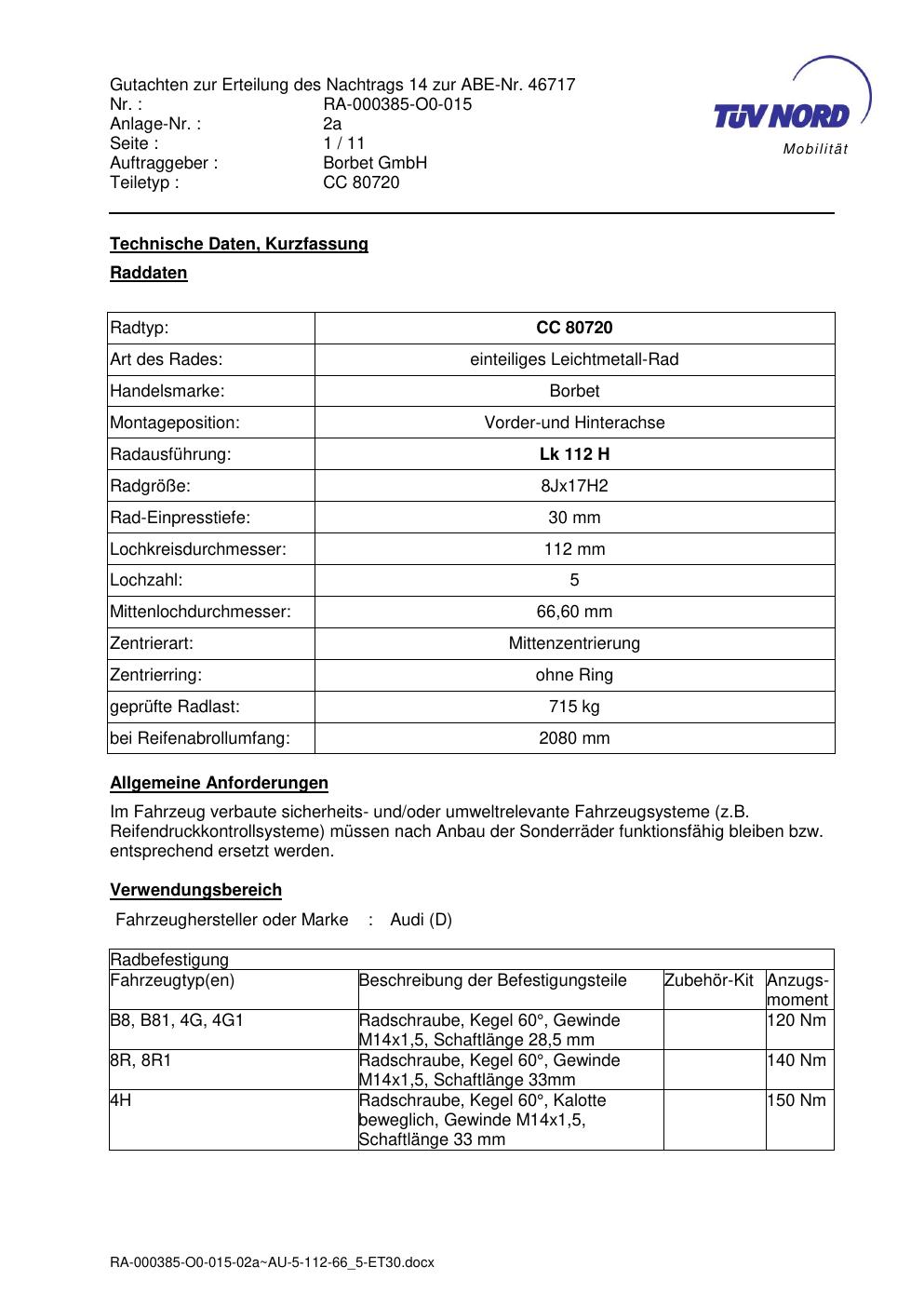 Dieses Gutachten (abe) bezieht sich auf die Alufelge brand-borbet CC 80720 in der Ausführung 8Jx17 ET 0, Mittenloch 0 mm (KBA 46717). Im PDF findest du typischerweise zulässige Reifengrößen, Auflagen/Anbauhinweise und – je nach Dokument – Hinweise zur Eintragung.