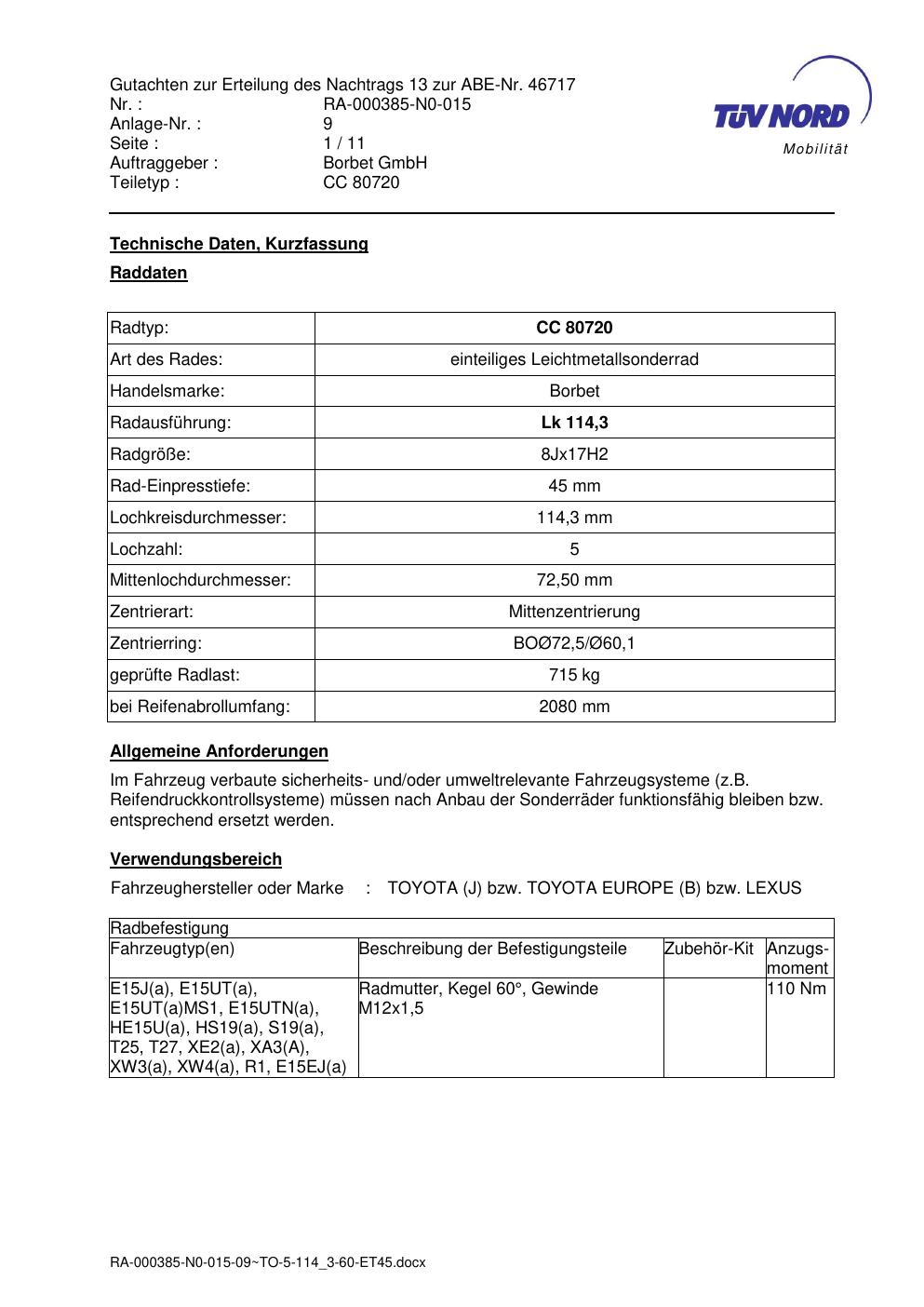 Dieses Gutachten (abe) bezieht sich auf die Alufelge brand-borbet CC 80720 in der Ausführung 8Jx17 ET 0, Mittenloch 0 mm (KBA 46717). Im PDF findest du typischerweise zulässige Reifengrößen, Auflagen/Anbauhinweise und – je nach Dokument – Hinweise zur Eintragung.