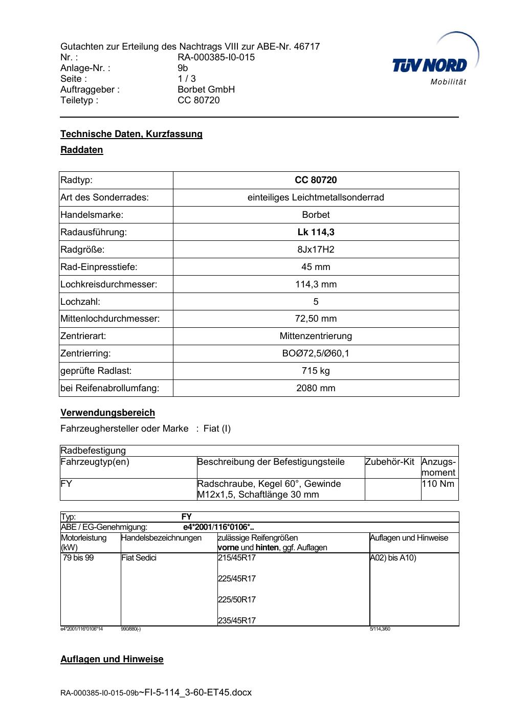 Dieses Gutachten (abe) bezieht sich auf die Alufelge brand-borbet CC 80720 in der Ausführung 8Jx17 ET 0, Mittenloch 0 mm (KBA 46717). Im PDF findest du typischerweise zulässige Reifengrößen, Auflagen/Anbauhinweise und – je nach Dokument – Hinweise zur Eintragung.