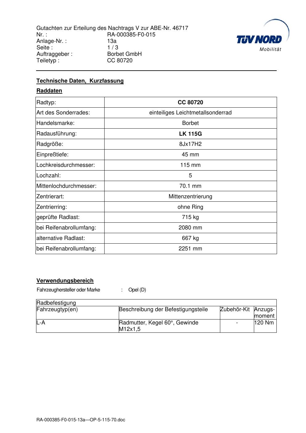 Dieses Gutachten (abe) bezieht sich auf die Alufelge brand-borbet CC 80720 in der Ausführung 8Jx17 ET 0, Mittenloch 0 mm (KBA 46717). Im PDF findest du typischerweise zulässige Reifengrößen, Auflagen/Anbauhinweise und – je nach Dokument – Hinweise zur Eintragung.