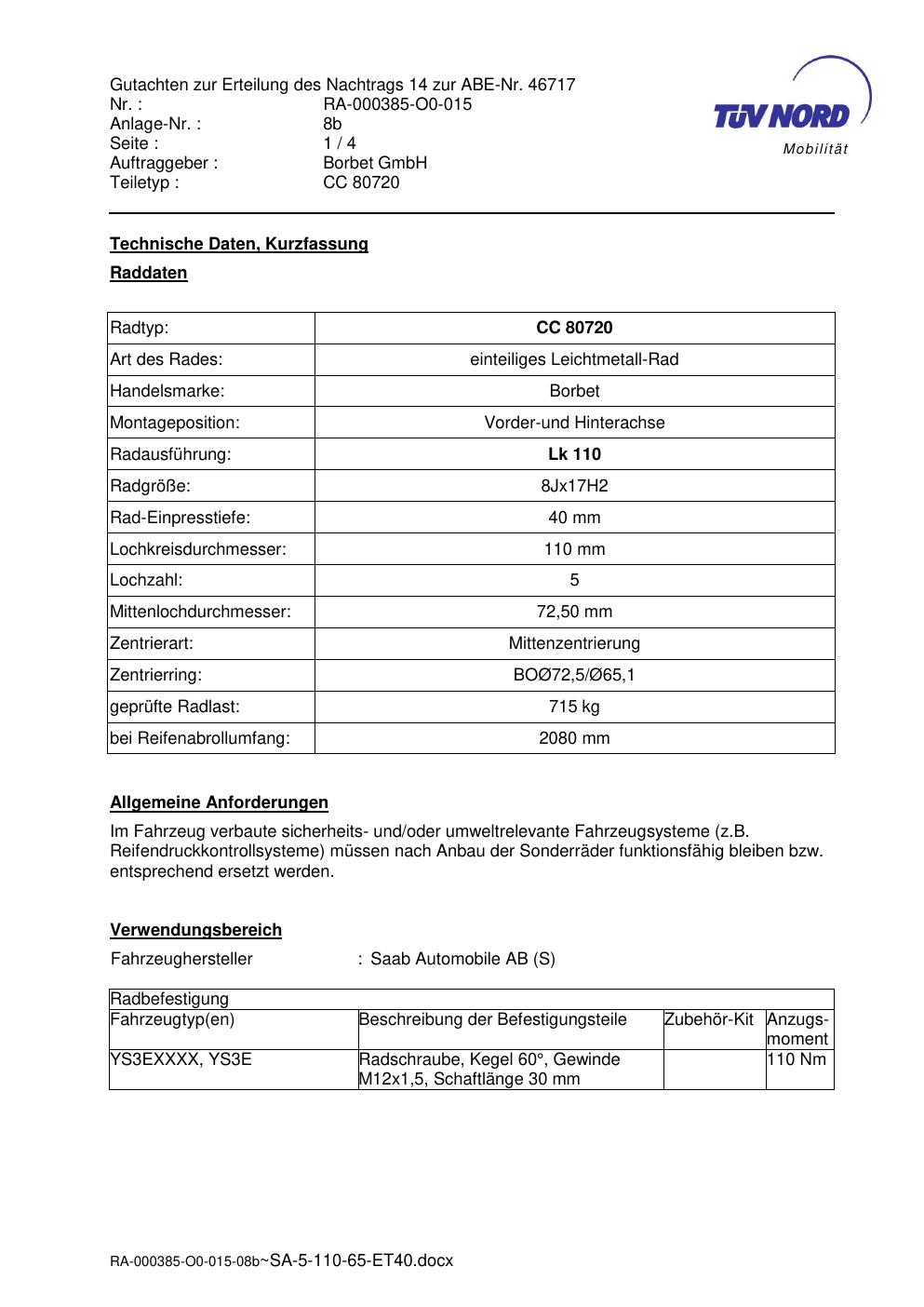 Dieses Gutachten (abe) bezieht sich auf die Alufelge Borbet CC 80720 in der Ausführung 8Jx17 ET 0, Mittenloch 0 mm (KBA 46717). Im PDF findest du typischerweise zulässige Reifengrößen, Auflagen/Anbauhinweise und – je nach Dokument – Hinweise zur Eintragung.