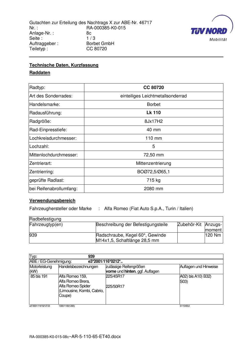Dieses Gutachten (abe) bezieht sich auf die Alufelge brand-borbet CC 80720 in der Ausführung 8Jx17 ET 0, Mittenloch 0 mm (KBA 46717). Im PDF findest du typischerweise zulässige Reifengrößen, Auflagen/Anbauhinweise und – je nach Dokument – Hinweise zur Eintragung.