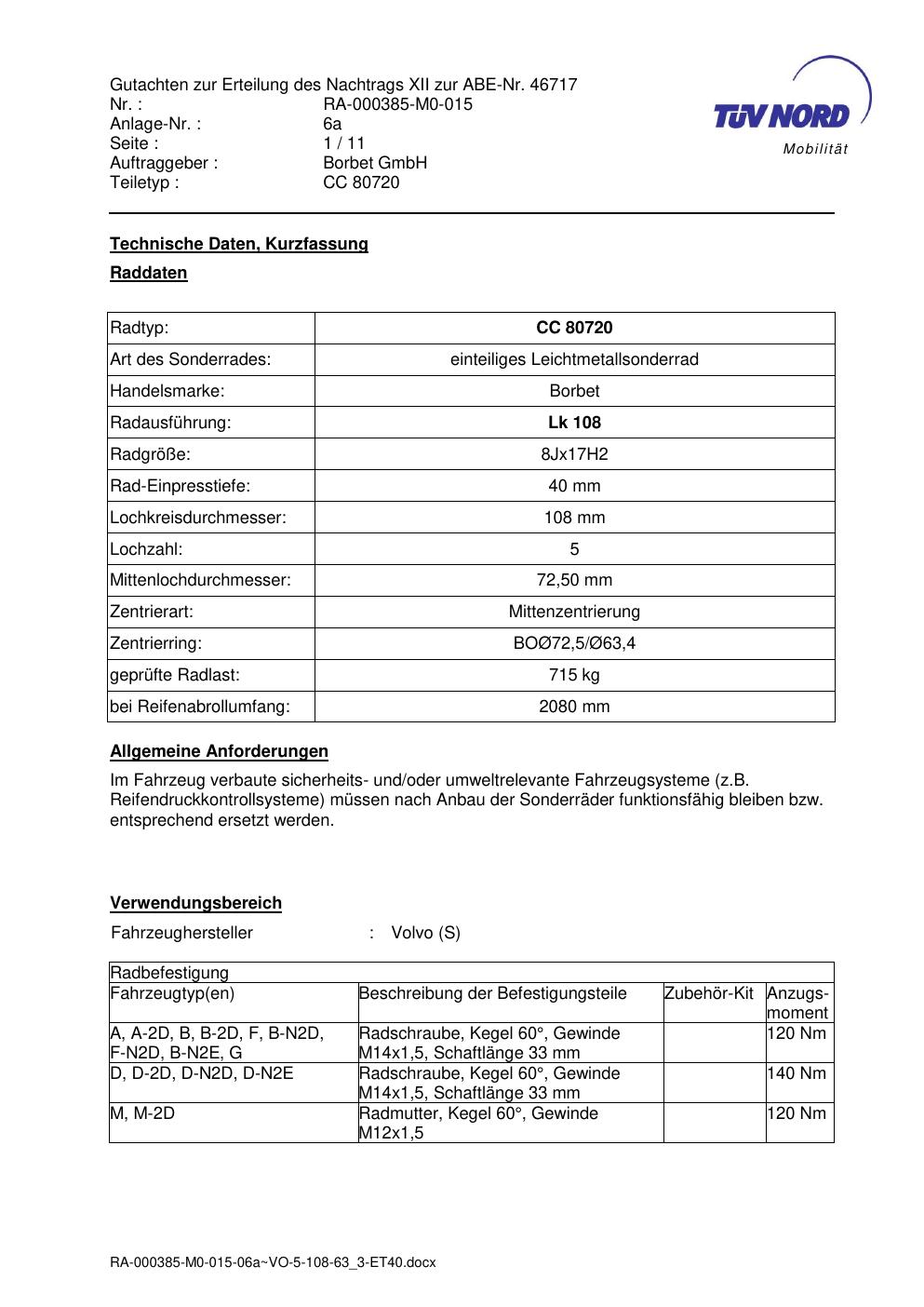 Dieses Gutachten (abe) bezieht sich auf die Alufelge brand-borbet CC 80720 in der Ausführung 8Jx17 ET 0, Mittenloch 0 mm (KBA 46717). Im PDF findest du typischerweise zulässige Reifengrößen, Auflagen/Anbauhinweise und – je nach Dokument – Hinweise zur Eintragung.