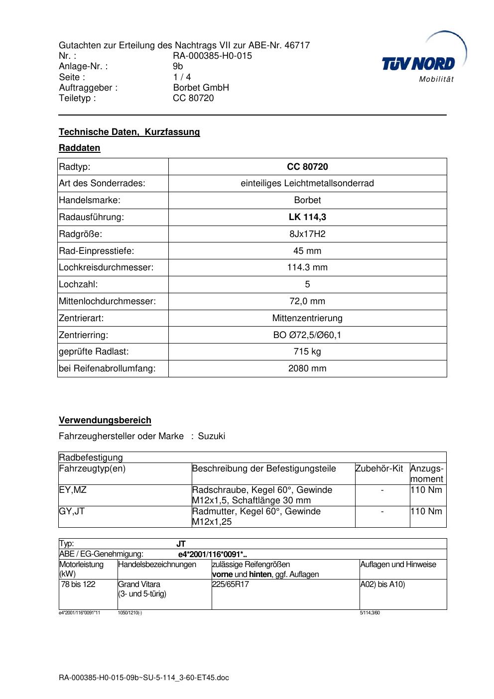 Dieses Gutachten (abe) bezieht sich auf die Alufelge brand-borbet CC 80720 in der Ausführung 8Jx17 ET 0, Mittenloch 0 mm (KBA 46717). Im PDF findest du typischerweise zulässige Reifengrößen, Auflagen/Anbauhinweise und – je nach Dokument – Hinweise zur Eintragung.