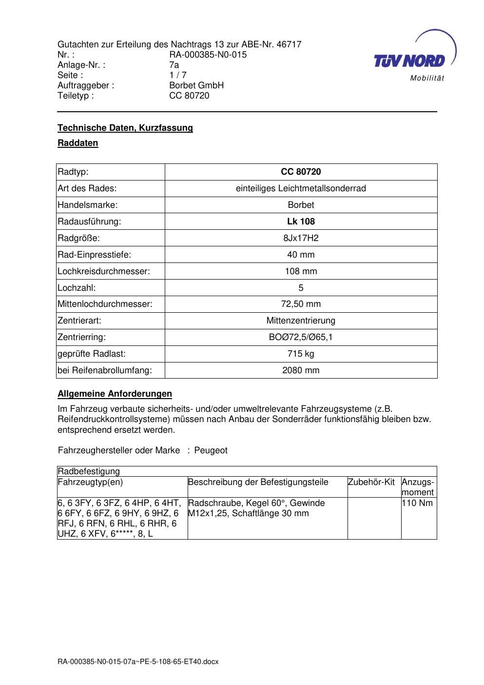 Dieses Gutachten (abe) bezieht sich auf die Alufelge brand-borbet CC 80720 in der Ausführung 8Jx17 ET 0, Mittenloch 0 mm (KBA 46717). Im PDF findest du typischerweise zulässige Reifengrößen, Auflagen/Anbauhinweise und – je nach Dokument – Hinweise zur Eintragung.