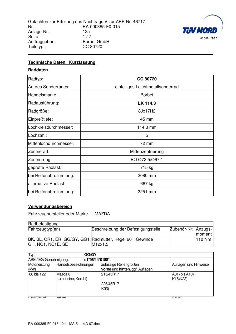 Dieses Gutachten (abe) bezieht sich auf die Alufelge brand-borbet CC 80720 in der Ausführung 8Jx17 ET 0, Mittenloch 0 mm (KBA 46717). Im PDF findest du typischerweise zulässige Reifengrößen, Auflagen/Anbauhinweise und – je nach Dokument – Hinweise zur Eintragung.