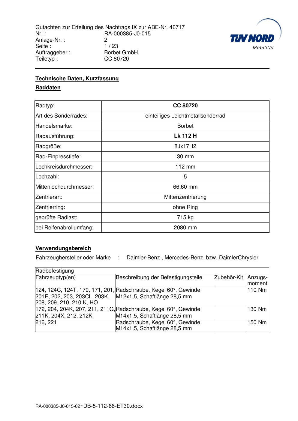 Dieses Gutachten (abe) bezieht sich auf die Alufelge brand-borbet CC 80720 in der Ausführung 8Jx17 ET 0, Mittenloch 0 mm (KBA 46717). Im PDF findest du typischerweise zulässige Reifengrößen, Auflagen/Anbauhinweise und – je nach Dokument – Hinweise zur Eintragung.