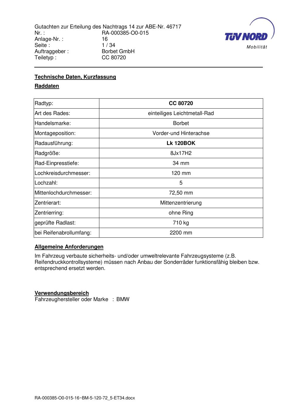 Dieses Gutachten (abe) bezieht sich auf die Alufelge brand-borbet CC 80720 in der Ausführung 8Jx17 ET 0, Mittenloch 0 mm (KBA 46717). Im PDF findest du typischerweise zulässige Reifengrößen, Auflagen/Anbauhinweise und – je nach Dokument – Hinweise zur Eintragung.
