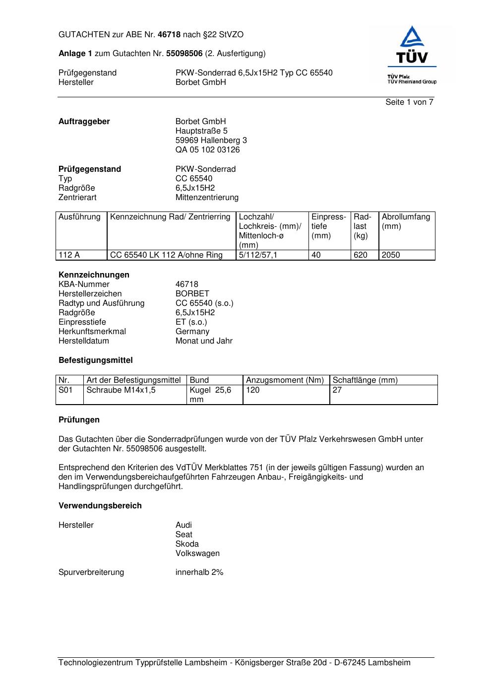 Dieses Gutachten (abe) bezieht sich auf die Alufelge Borbet CC 65540 in der Ausführung 6.5Jx15 ET 0, Mittenloch 0 mm (KBA 46718). Im PDF findest du typischerweise zulässige Reifengrößen, Auflagen/Anbauhinweise und – je nach Dokument – Hinweise zur Eintragung.