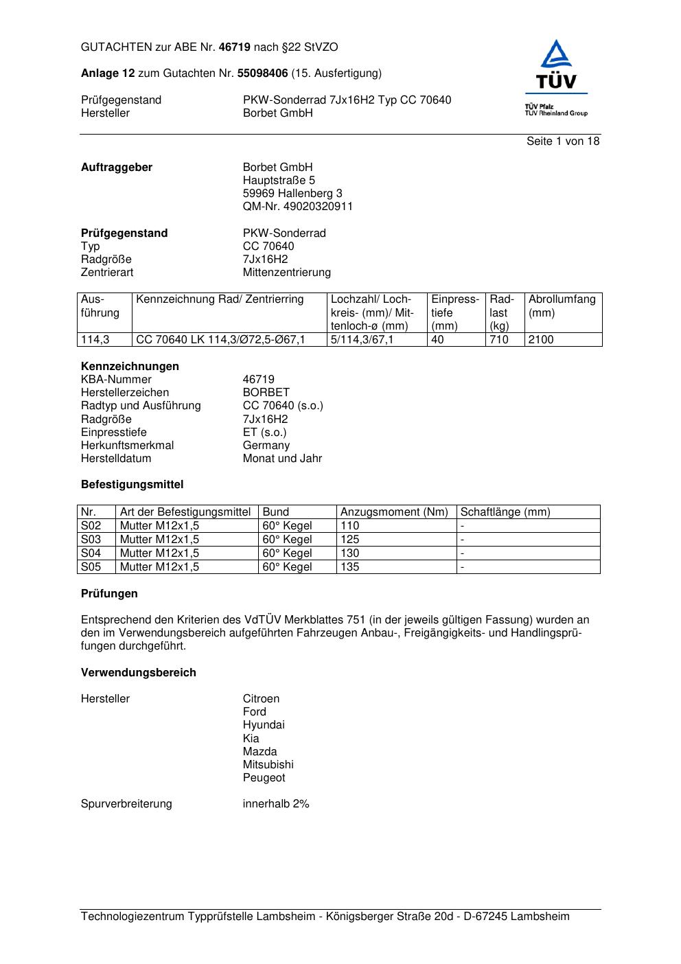 Dieses Gutachten (abe) bezieht sich auf die Alufelge Borbet CC 70640 in der Ausführung 7Jx16 ET 0, Mittenloch 0 mm (KBA 46719). Im PDF findest du typischerweise zulässige Reifengrößen, Auflagen/Anbauhinweise und – je nach Dokument – Hinweise zur Eintragung.