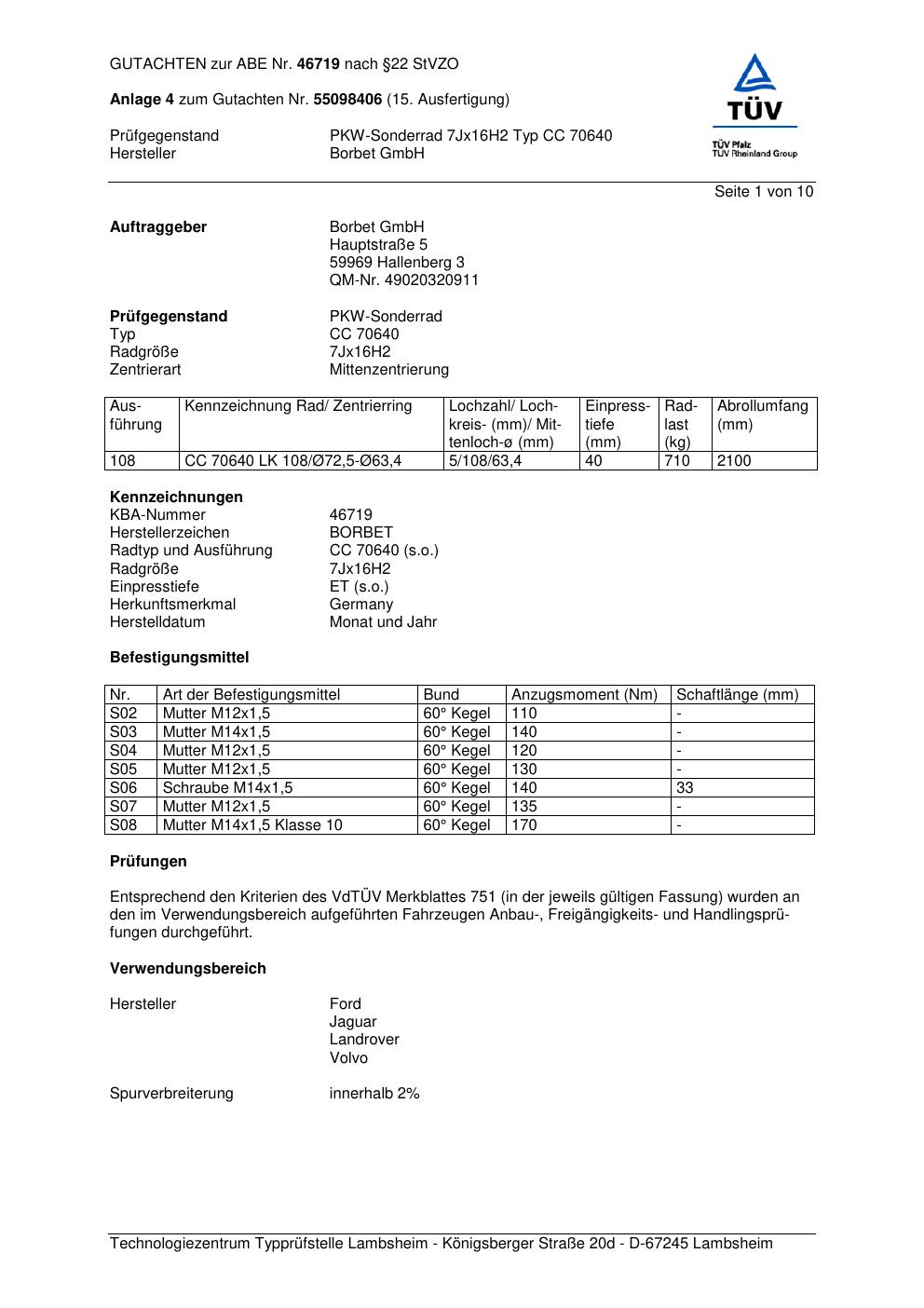 Dieses Gutachten (abe) bezieht sich auf die Alufelge Borbet CC 70640 in der Ausführung 7Jx16 ET 0, Mittenloch 0 mm (KBA 46719). Im PDF findest du typischerweise zulässige Reifengrößen, Auflagen/Anbauhinweise und – je nach Dokument – Hinweise zur Eintragung.