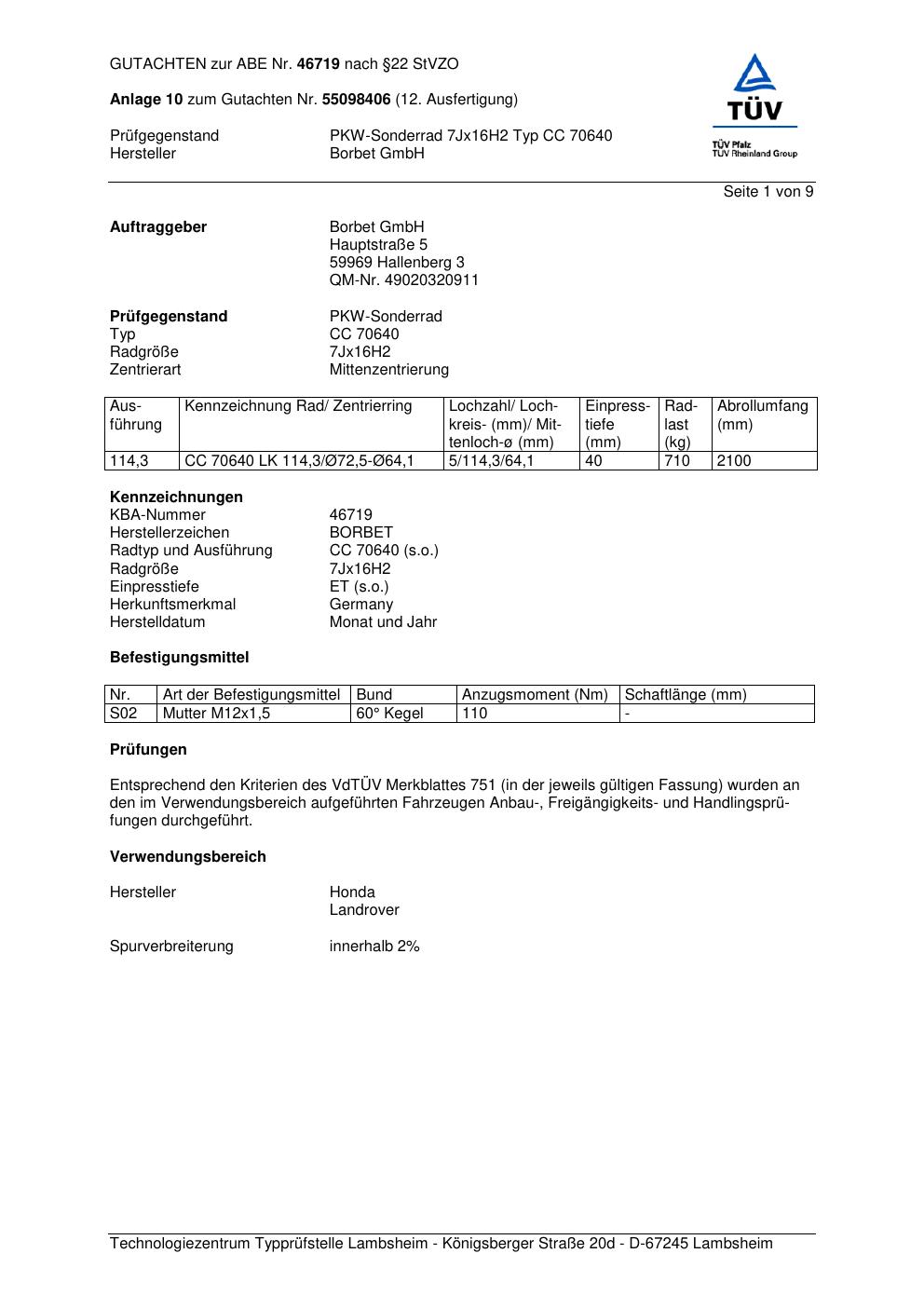 Dieses Gutachten (abe) bezieht sich auf die Alufelge Borbet CC 70640 in der Ausführung 7Jx16 ET 0, Mittenloch 0 mm (KBA 46719). Im PDF findest du typischerweise zulässige Reifengrößen, Auflagen/Anbauhinweise und – je nach Dokument – Hinweise zur Eintragung.