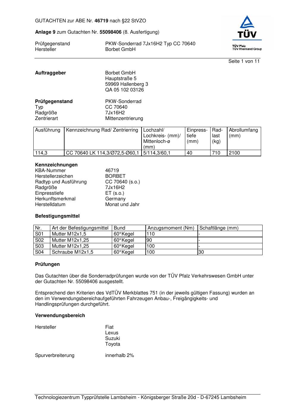 Dieses Gutachten (abe) bezieht sich auf die Alufelge Borbet CC 70640 in der Ausführung 7Jx16 ET 0, Mittenloch 0 mm (KBA 46719). Im PDF findest du typischerweise zulässige Reifengrößen, Auflagen/Anbauhinweise und – je nach Dokument – Hinweise zur Eintragung.