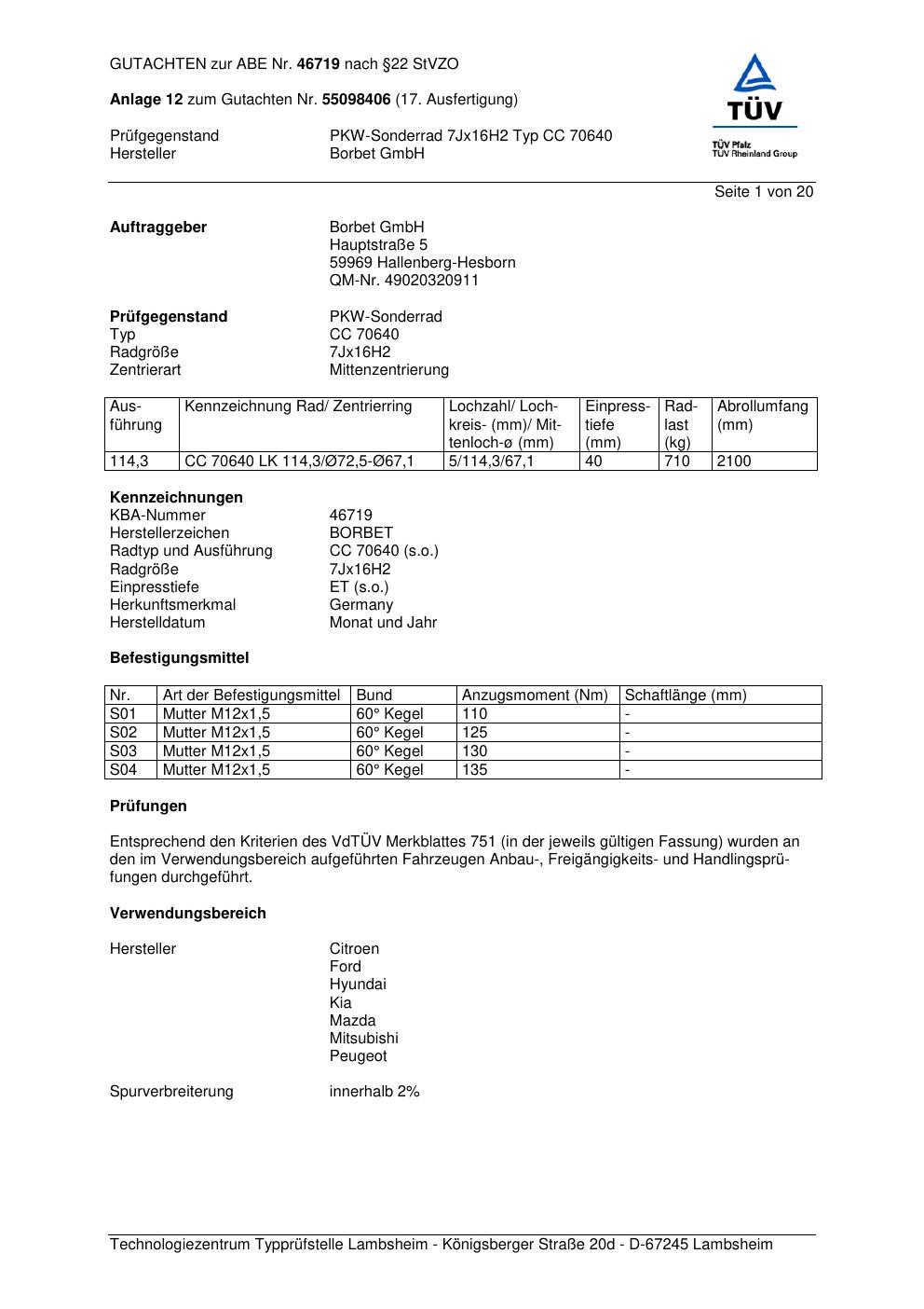 Dieses Gutachten (abe) bezieht sich auf die Alufelge Borbet CC 70640 in der Ausführung 7Jx16 ET 0, Mittenloch 0 mm (KBA 46719). Im PDF findest du typischerweise zulässige Reifengrößen, Auflagen/Anbauhinweise und – je nach Dokument – Hinweise zur Eintragung.