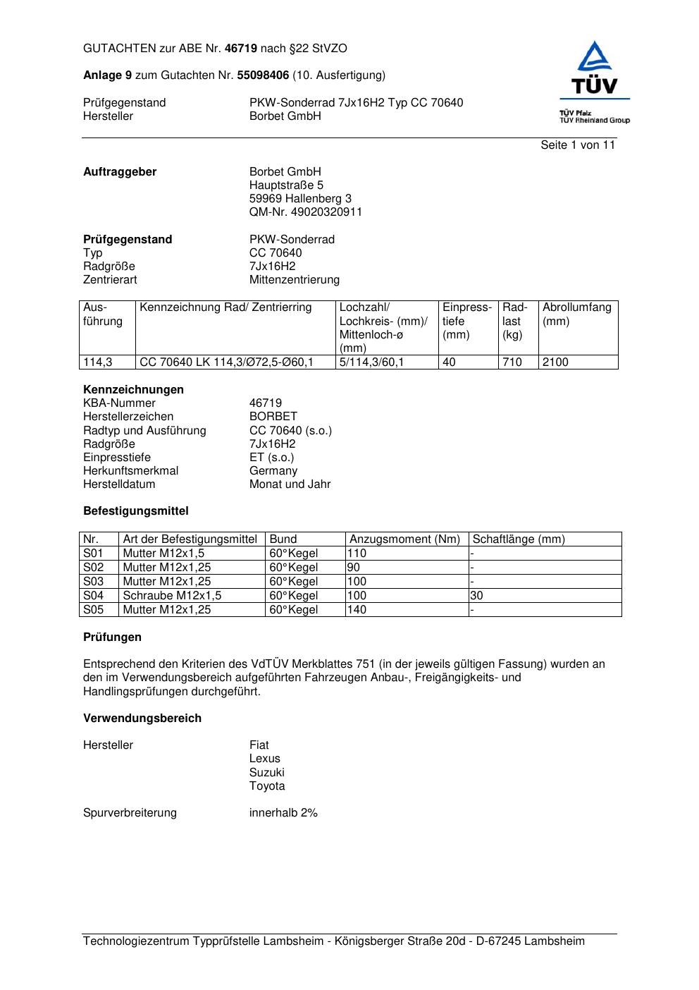Dieses Gutachten (abe) bezieht sich auf die Alufelge Borbet CC 70640 in der Ausführung 7Jx16 ET 0, Mittenloch 0 mm (KBA 46719). Im PDF findest du typischerweise zulässige Reifengrößen, Auflagen/Anbauhinweise und – je nach Dokument – Hinweise zur Eintragung.