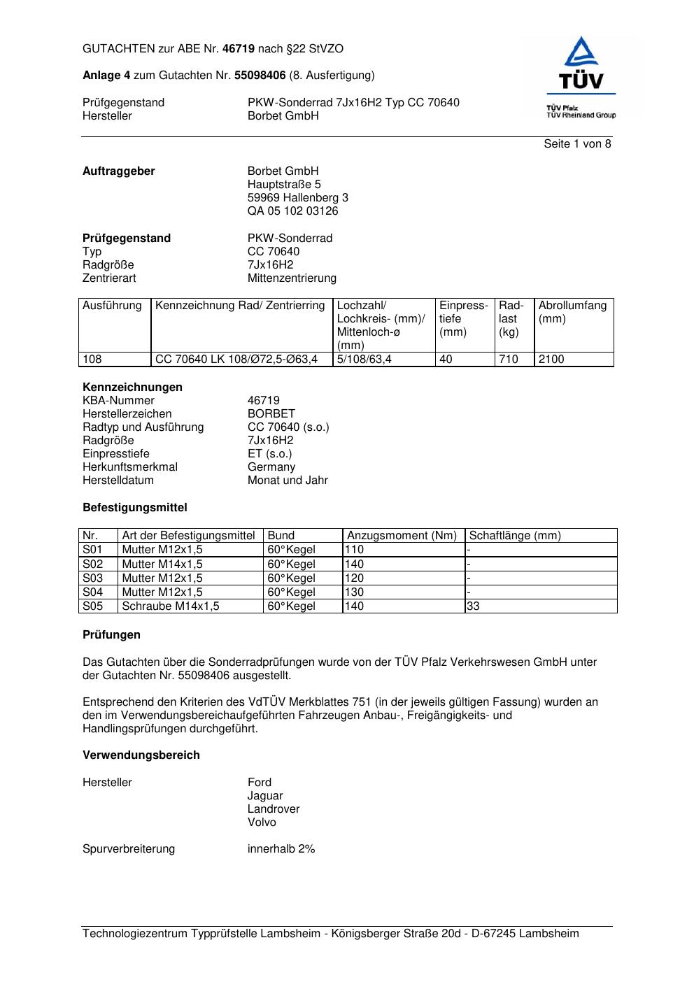 Dieses Gutachten (abe) bezieht sich auf die Alufelge Borbet CC 70640 in der Ausführung 7Jx16 ET 0, Mittenloch 0 mm (KBA 46719). Im PDF findest du typischerweise zulässige Reifengrößen, Auflagen/Anbauhinweise und – je nach Dokument – Hinweise zur Eintragung.