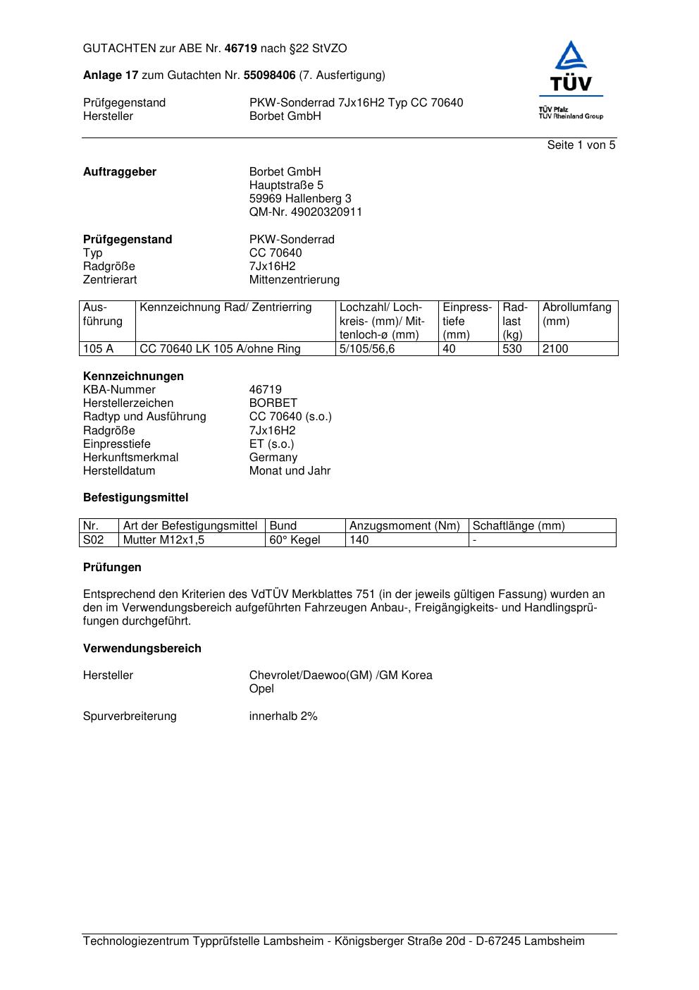 Dieses Gutachten (abe) bezieht sich auf die Alufelge Borbet CC 70640 in der Ausführung 7Jx16 ET 0, Mittenloch 0 mm (KBA 46719). Im PDF findest du typischerweise zulässige Reifengrößen, Auflagen/Anbauhinweise und – je nach Dokument – Hinweise zur Eintragung.
