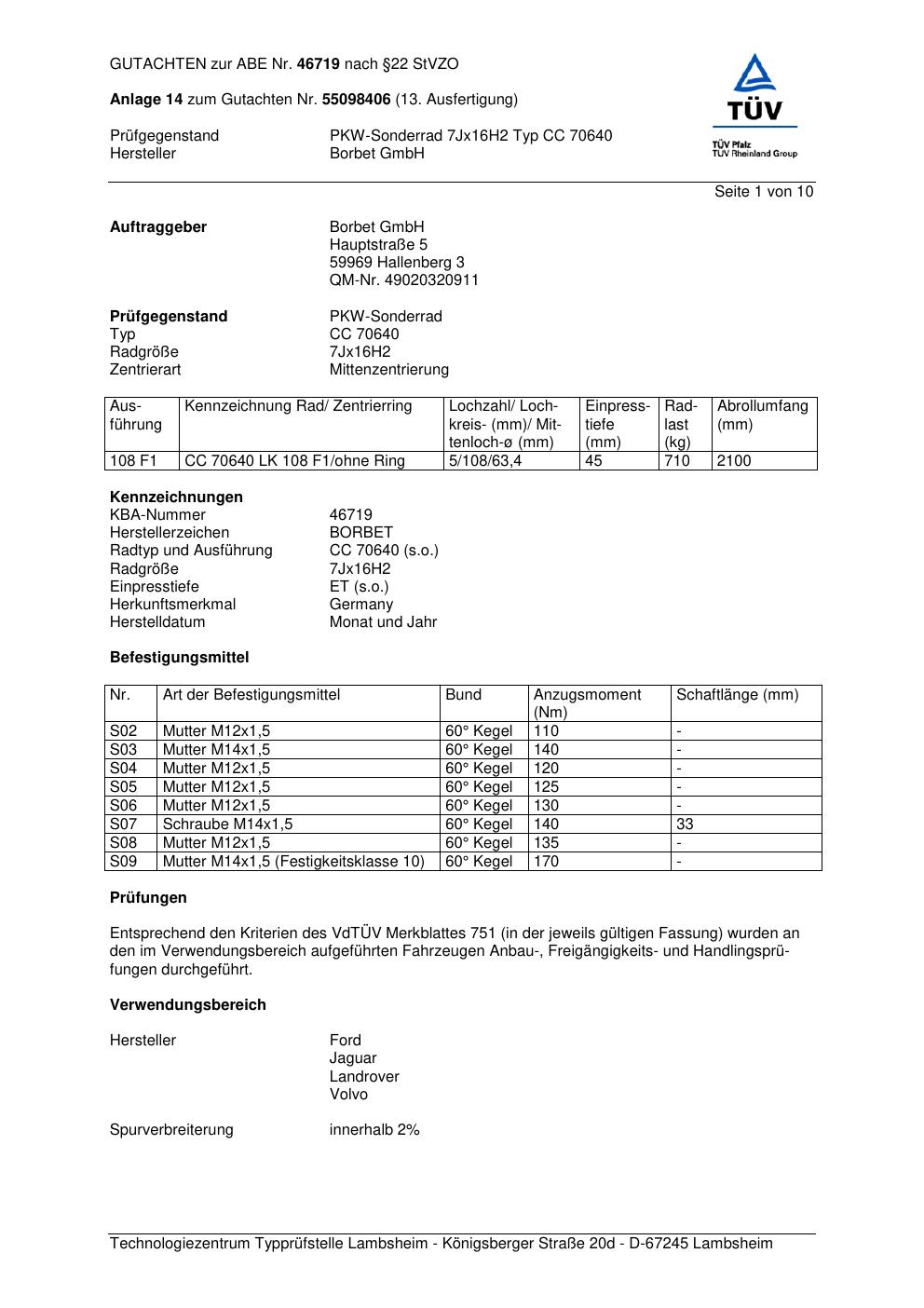 Dieses Gutachten (abe) bezieht sich auf die Alufelge Borbet CC 70640 in der Ausführung 7Jx16 ET 0, Mittenloch 0 mm (KBA 46719). Im PDF findest du typischerweise zulässige Reifengrößen, Auflagen/Anbauhinweise und – je nach Dokument – Hinweise zur Eintragung.