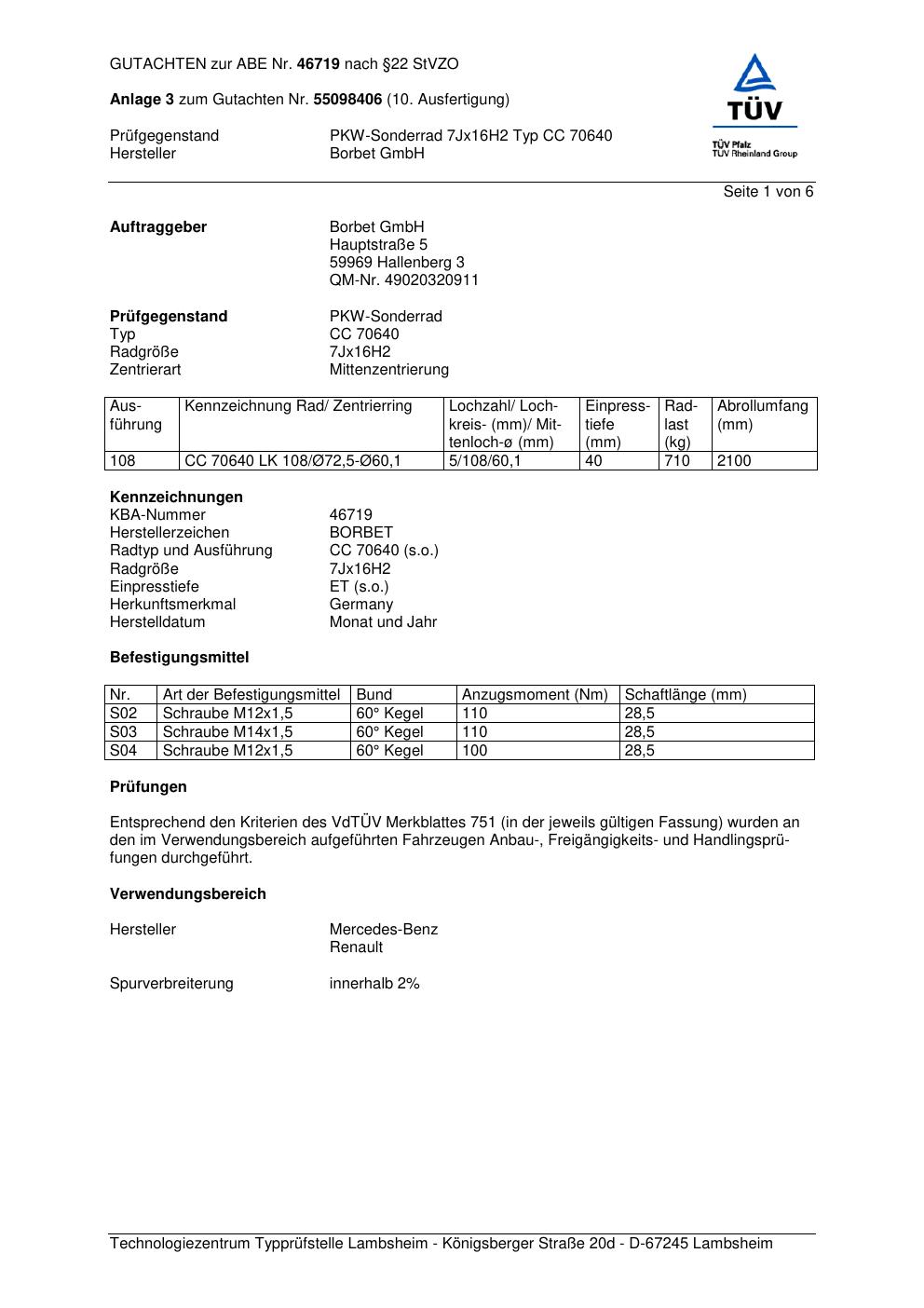 Dieses Gutachten (abe) bezieht sich auf die Alufelge Borbet CC 70640 in der Ausführung 7Jx16 ET 0, Mittenloch 0 mm (KBA 46719). Im PDF findest du typischerweise zulässige Reifengrößen, Auflagen/Anbauhinweise und – je nach Dokument – Hinweise zur Eintragung.