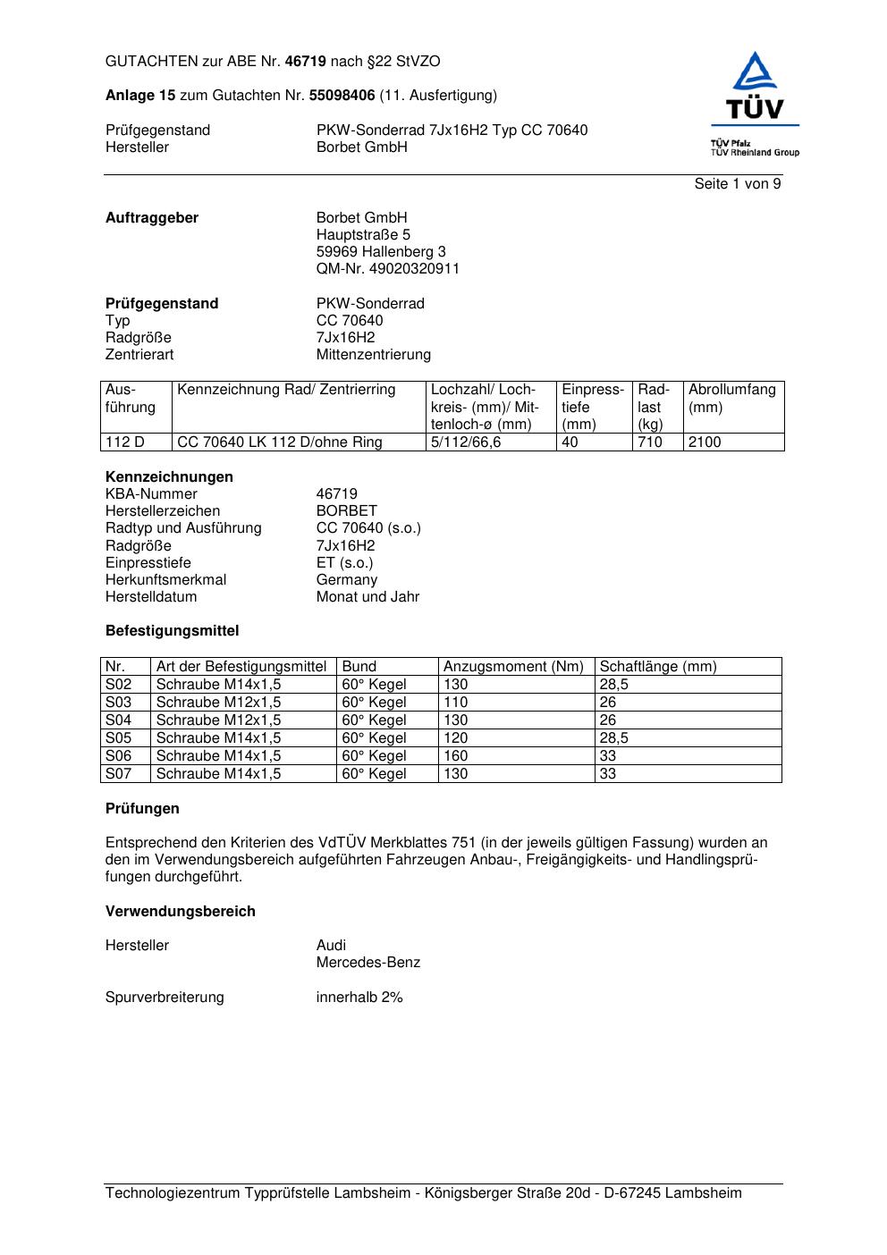 Dieses Gutachten (abe) bezieht sich auf die Alufelge Borbet CC 70640 in der Ausführung 7Jx16 ET 0, Mittenloch 0 mm (KBA 46719). Im PDF findest du typischerweise zulässige Reifengrößen, Auflagen/Anbauhinweise und – je nach Dokument – Hinweise zur Eintragung.