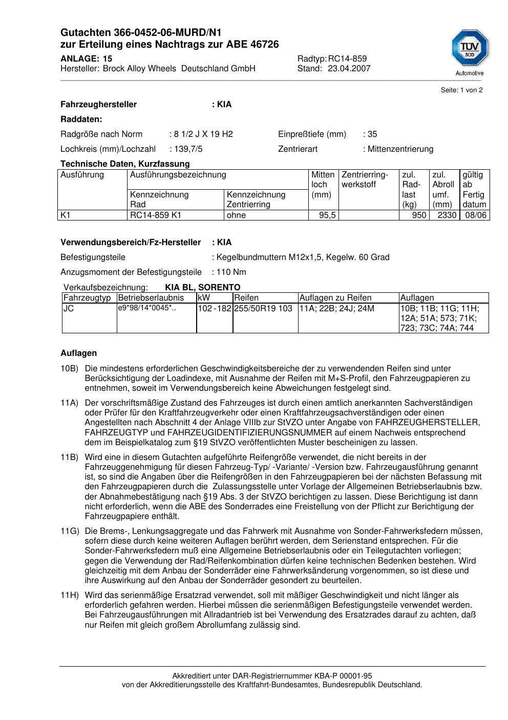 Dieses Gutachten (abe) bezieht sich auf die Alufelge Brock RC14-859 in der Ausführung 2Jx19 ET 0, Mittenloch 0 mm (KBA 46726). Im PDF findest du typischerweise zulässige Reifengrößen, Auflagen/Anbauhinweise und – je nach Dokument – Hinweise zur Eintragung.