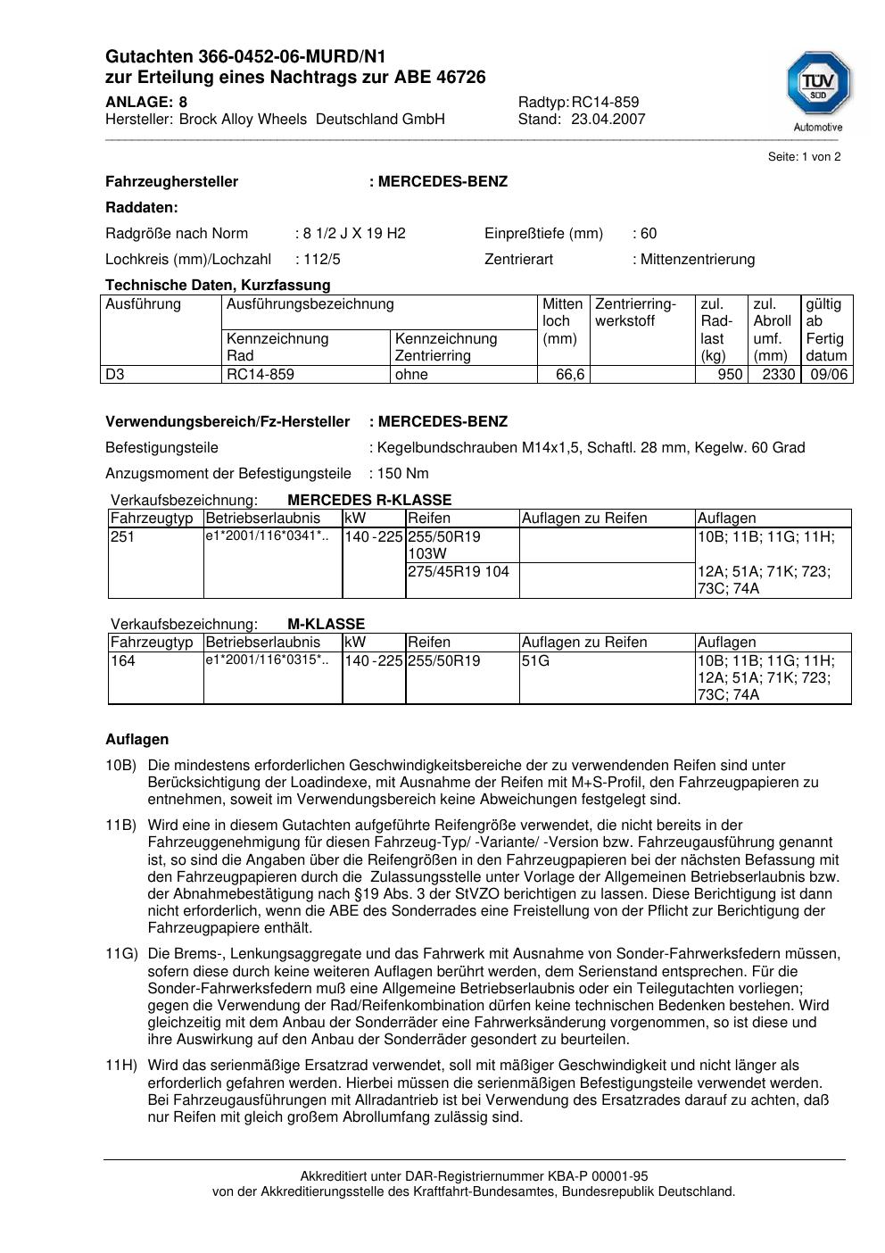 Dieses Gutachten (abe) bezieht sich auf die Alufelge Brock RC14-859 in der Ausführung 2Jx19 ET 0, Mittenloch 0 mm (KBA 46726). Im PDF findest du typischerweise zulässige Reifengrößen, Auflagen/Anbauhinweise und – je nach Dokument – Hinweise zur Eintragung.