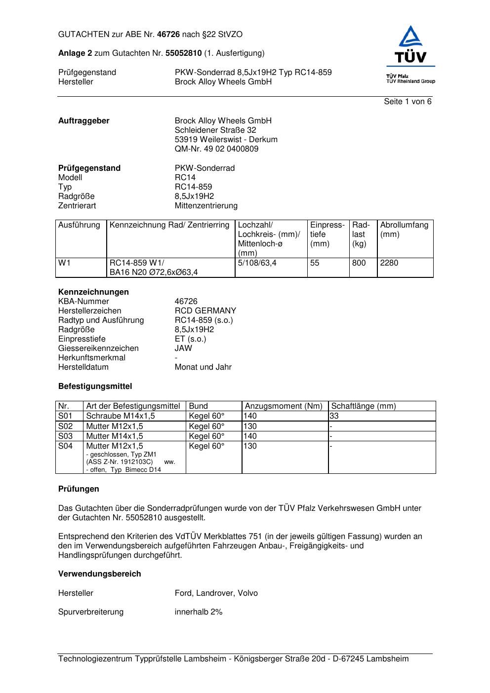 Dieses Gutachten (abe) bezieht sich auf die Alufelge Brock RC14-859 in der Ausführung 8.5Jx19 ET 0, Mittenloch 0 mm (KBA 46726). Im PDF findest du typischerweise zulässige Reifengrößen, Auflagen/Anbauhinweise und – je nach Dokument – Hinweise zur Eintragung.