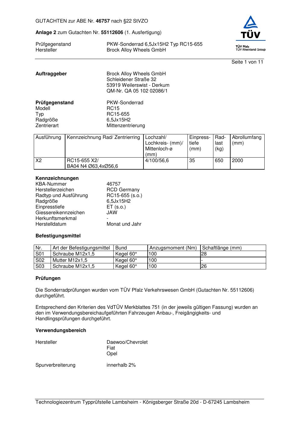 Dieses Gutachten (abe) bezieht sich auf die Alufelge Brock RC15-655 in der Ausführung 6.5Jx15 ET 0, Mittenloch 0 mm (KBA 46757). Im PDF findest du typischerweise zulässige Reifengrößen, Auflagen/Anbauhinweise und – je nach Dokument – Hinweise zur Eintragung.