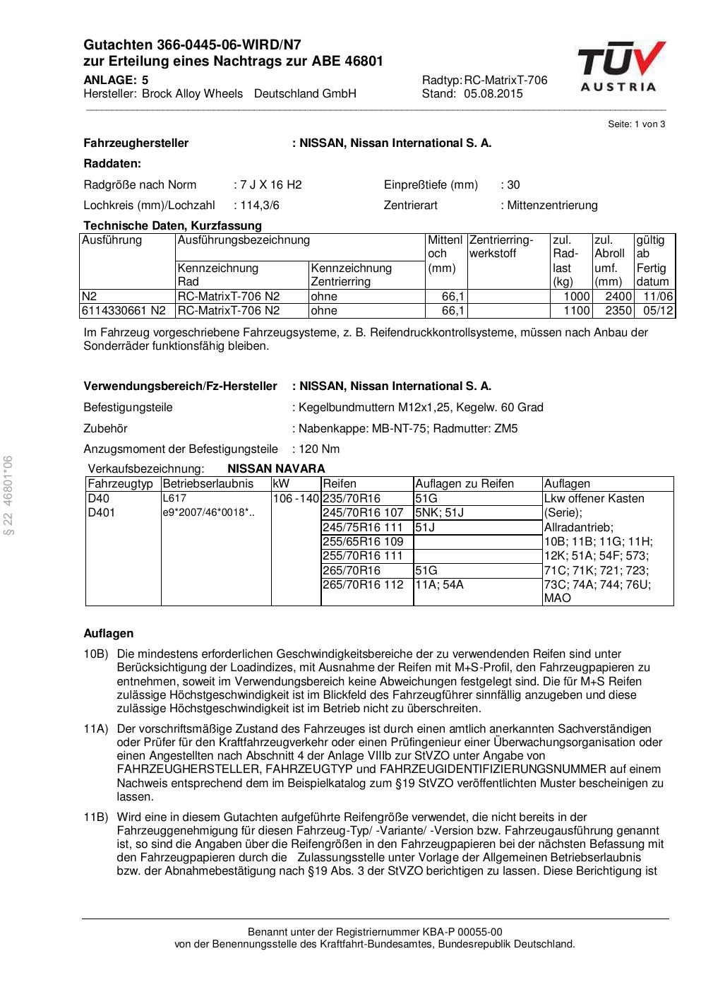 Dieses Gutachten (abe) bezieht sich auf die Alufelge Brock RC-MatrixT- 706 in der Ausführung 7Jx16 ET 0, Mittenloch 0 mm (KBA 46801). Im PDF findest du typischerweise zulässige Reifengrößen, Auflagen/Anbauhinweise und – je nach Dokument – Hinweise zur Eintragung.