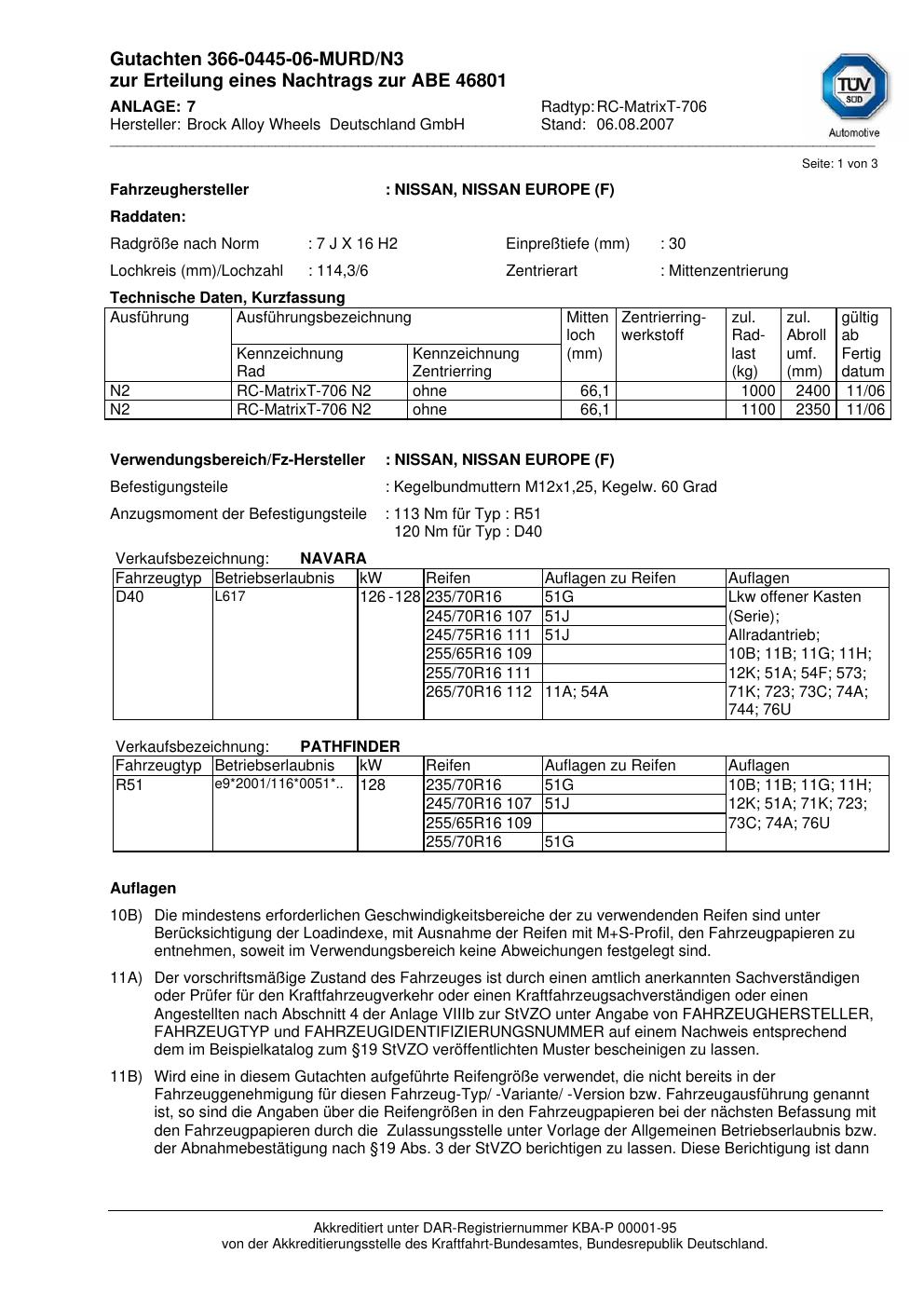 Dieses Gutachten (abe) bezieht sich auf die Alufelge Brock RC-MatrixT-706 in der Ausführung 7Jx16 ET 0, Mittenloch 0 mm (KBA 46801). Im PDF findest du typischerweise zulässige Reifengrößen, Auflagen/Anbauhinweise und – je nach Dokument – Hinweise zur Eintragung.