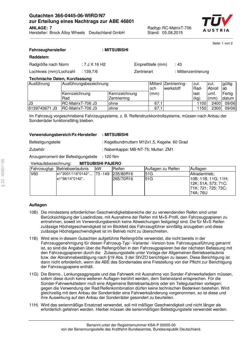 Dieses Gutachten (abe) bezieht sich auf die Alufelge Brock RC-MatrixT- 706 in der Ausführung 7Jx16 ET 0, Mittenloch 0 mm (KBA 46801). Im PDF findest du typischerweise zulässige Reifengrößen, Auflagen/Anbauhinweise und – je nach Dokument – Hinweise zur Eintragung.