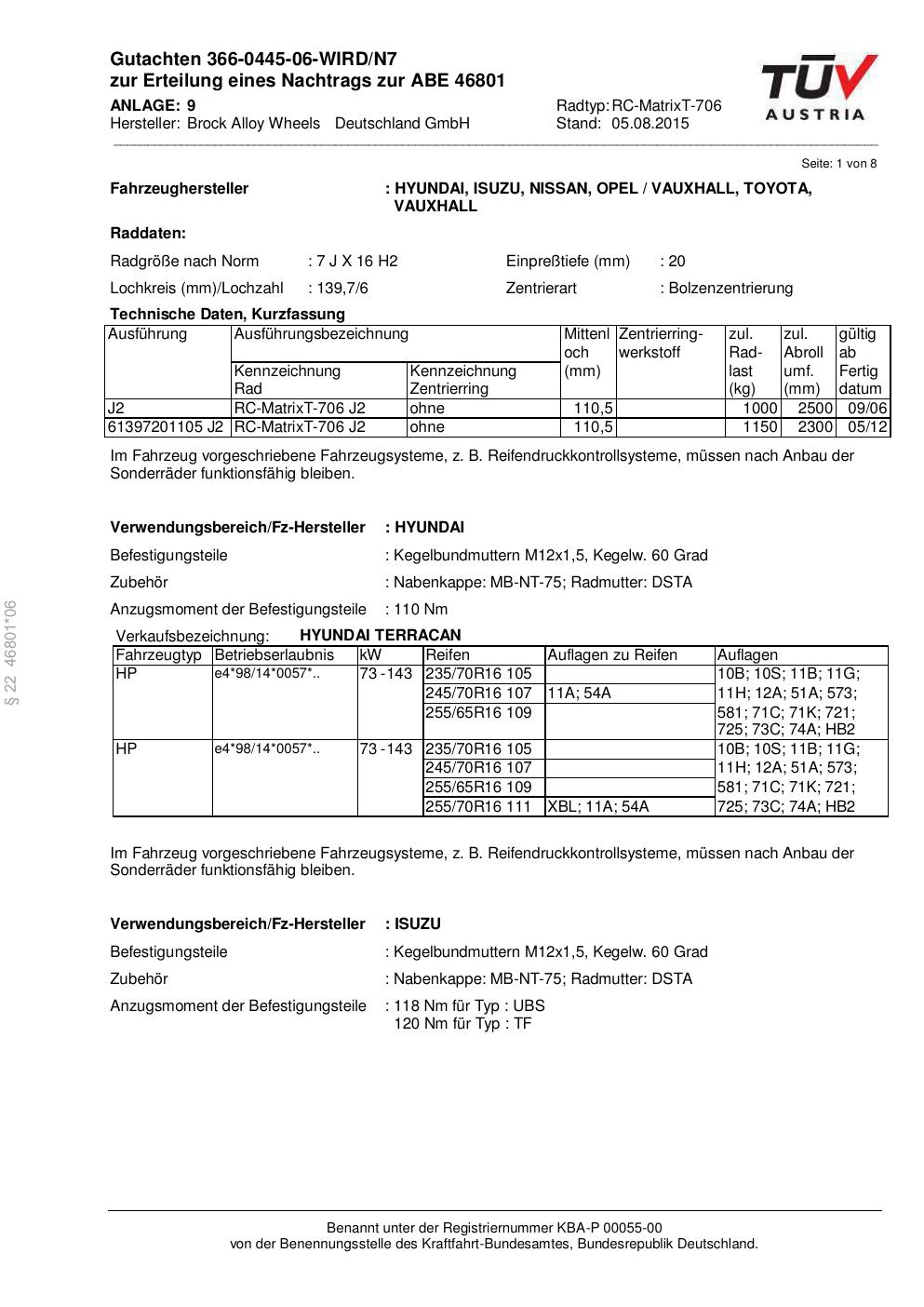 Dieses Gutachten (abe) bezieht sich auf die Alufelge Brock RC-MatrixT- 706 in der Ausführung 7Jx16 ET 0, Mittenloch 0 mm (KBA 46801). Im PDF findest du typischerweise zulässige Reifengrößen, Auflagen/Anbauhinweise und – je nach Dokument – Hinweise zur Eintragung.