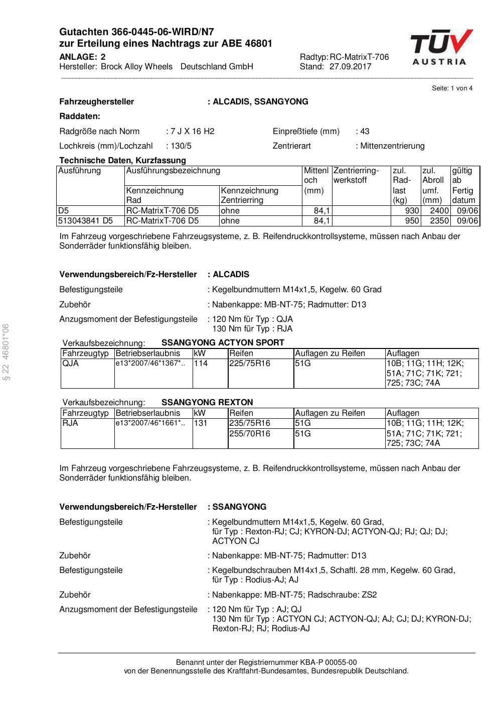 Dieses Gutachten (abe) bezieht sich auf die Alufelge Brock RC-MatrixT- 706 in der Ausführung 7Jx16 ET 0, Mittenloch 0 mm (KBA 46801). Im PDF findest du typischerweise zulässige Reifengrößen, Auflagen/Anbauhinweise und – je nach Dokument – Hinweise zur Eintragung.