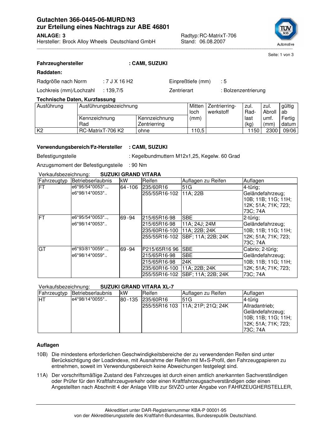Dieses Gutachten (abe) bezieht sich auf die Alufelge Brock RC-MatrixT-706 in der Ausführung 7Jx16 ET 0, Mittenloch 0 mm (KBA 46801). Im PDF findest du typischerweise zulässige Reifengrößen, Auflagen/Anbauhinweise und – je nach Dokument – Hinweise zur Eintragung.