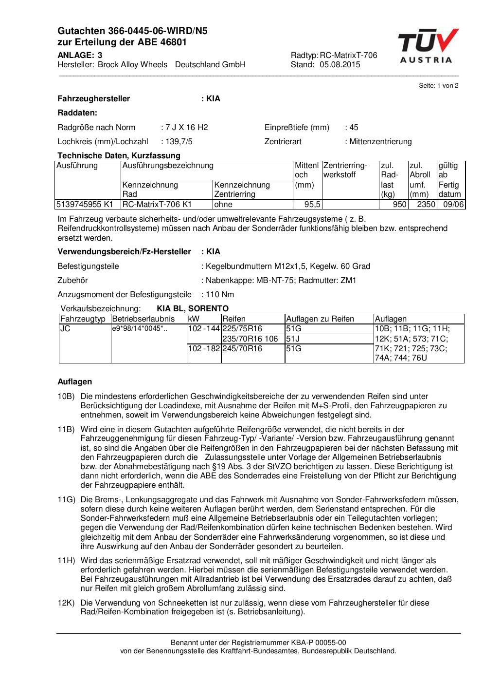 Dieses Gutachten (abe) bezieht sich auf die Alufelge Brock RC-MatrixT -706 in der Ausführung 7Jx16 ET 0, Mittenloch 0 mm (KBA 46801). Im PDF findest du typischerweise zulässige Reifengrößen, Auflagen/Anbauhinweise und – je nach Dokument – Hinweise zur Eintragung.
