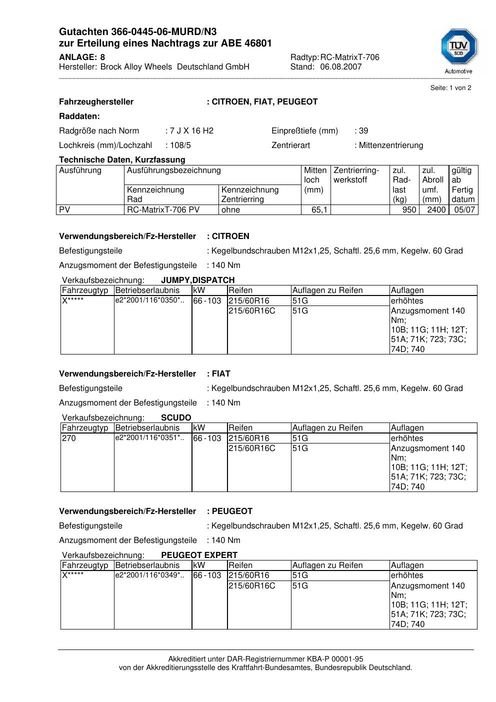 Dieses Gutachten (abe) bezieht sich auf die Alufelge Brock RC-MatrixT-706 in der Ausführung 7Jx16 ET 0, Mittenloch 0 mm (KBA 46801). Im PDF findest du typischerweise zulässige Reifengrößen, Auflagen/Anbauhinweise und – je nach Dokument – Hinweise zur Eintragung.