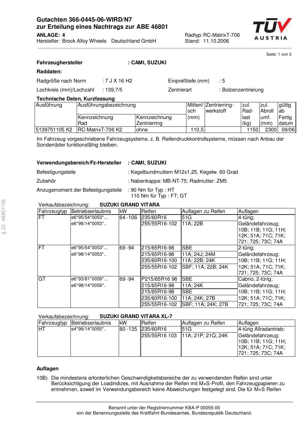 Dieses Gutachten (abe) bezieht sich auf die Alufelge Brock RC-MatrixT- 706 in der Ausführung 7Jx16 ET 0, Mittenloch 0 mm (KBA 46801). Im PDF findest du typischerweise zulässige Reifengrößen, Auflagen/Anbauhinweise und – je nach Dokument – Hinweise zur Eintragung.