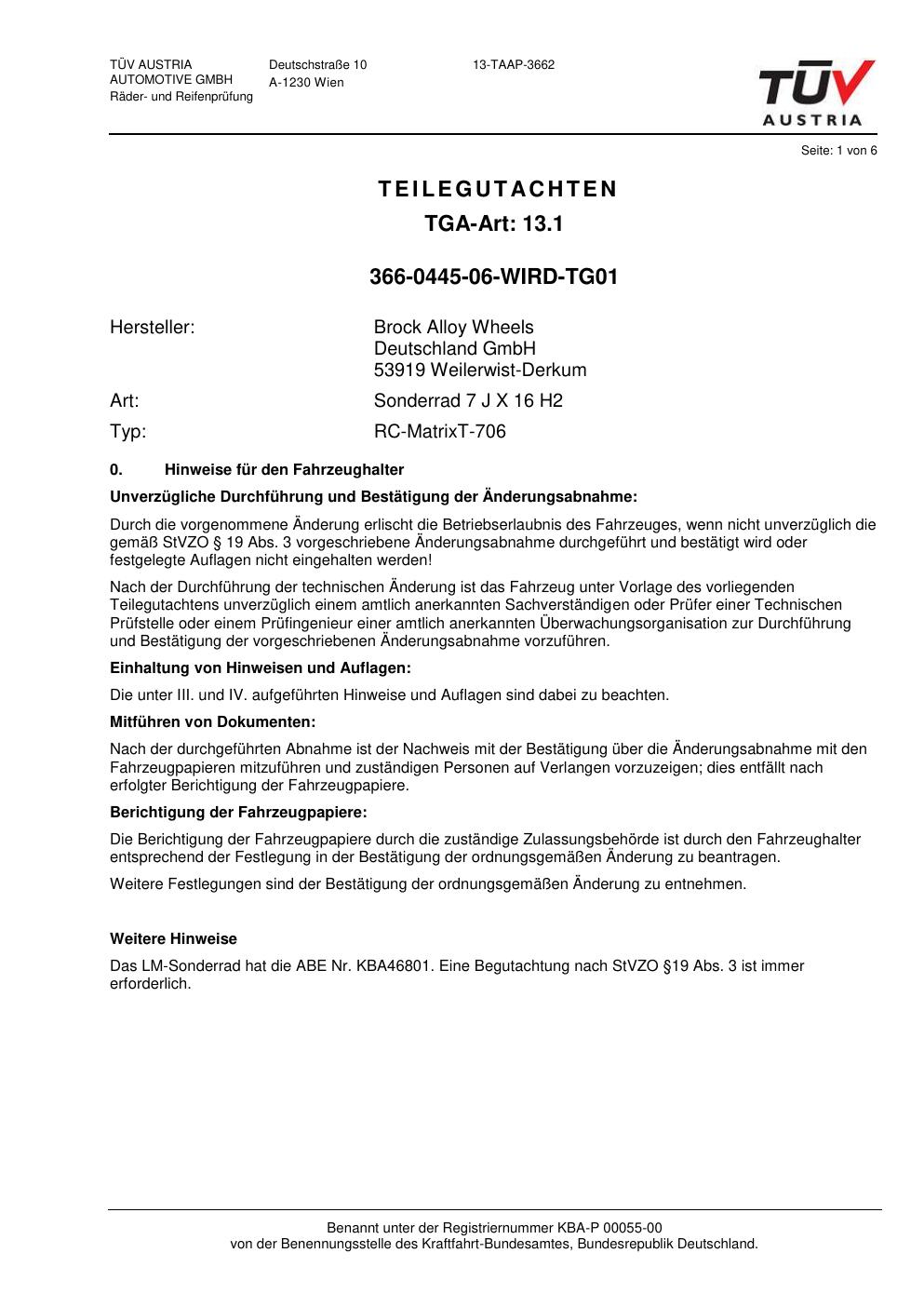 Dieses Gutachten (abe) bezieht sich auf die Alufelge Brock RC-MatrixT -706 in der Ausführung 7Jx16 ET 0, Mittenloch 0 mm (KBA 46801). Im PDF findest du typischerweise zulässige Reifengrößen, Auflagen/Anbauhinweise und – je nach Dokument – Hinweise zur Eintragung.