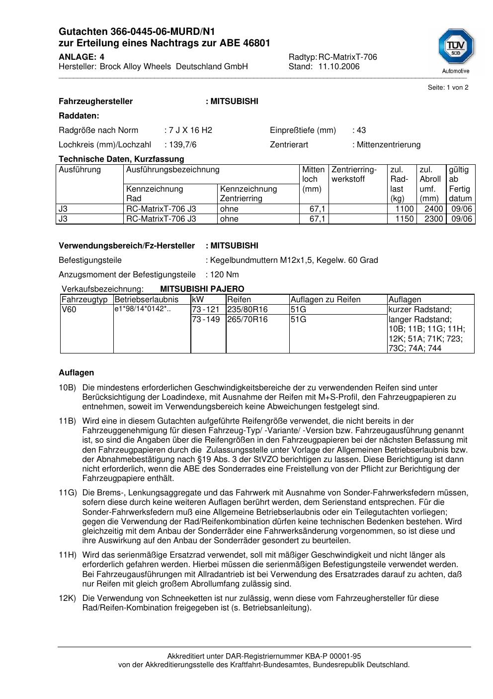 Dieses Gutachten (abe) bezieht sich auf die Alufelge Brock RC-MatrixT-706 in der Ausführung 7Jx16 ET 0, Mittenloch 0 mm (KBA 46801). Im PDF findest du typischerweise zulässige Reifengrößen, Auflagen/Anbauhinweise und – je nach Dokument – Hinweise zur Eintragung.