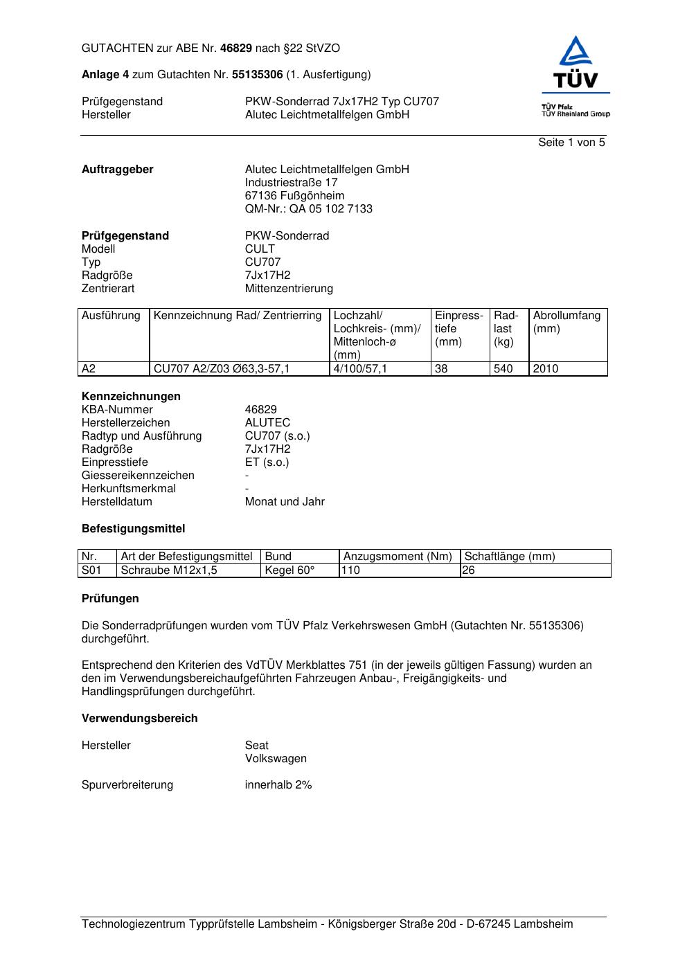 Dieses Gutachten (abe) bezieht sich auf die Alufelge ALUTEC CU707 in der Ausführung 7Jx17 ET 0, Mittenloch 0 mm (KBA 46829). Im PDF findest du typischerweise zulässige Reifengrößen, Auflagen/Anbauhinweise und – je nach Dokument – Hinweise zur Eintragung.