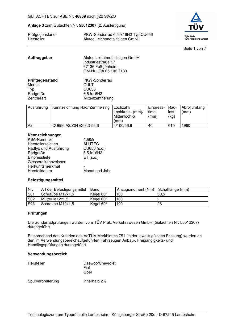 Dieses Gutachten (abe) bezieht sich auf die Alufelge ALUTEC CU656 in der Ausführung 6.5Jx16 ET 0, Mittenloch 0 mm (KBA 46859). Im PDF findest du typischerweise zulässige Reifengrößen, Auflagen/Anbauhinweise und – je nach Dokument – Hinweise zur Eintragung.