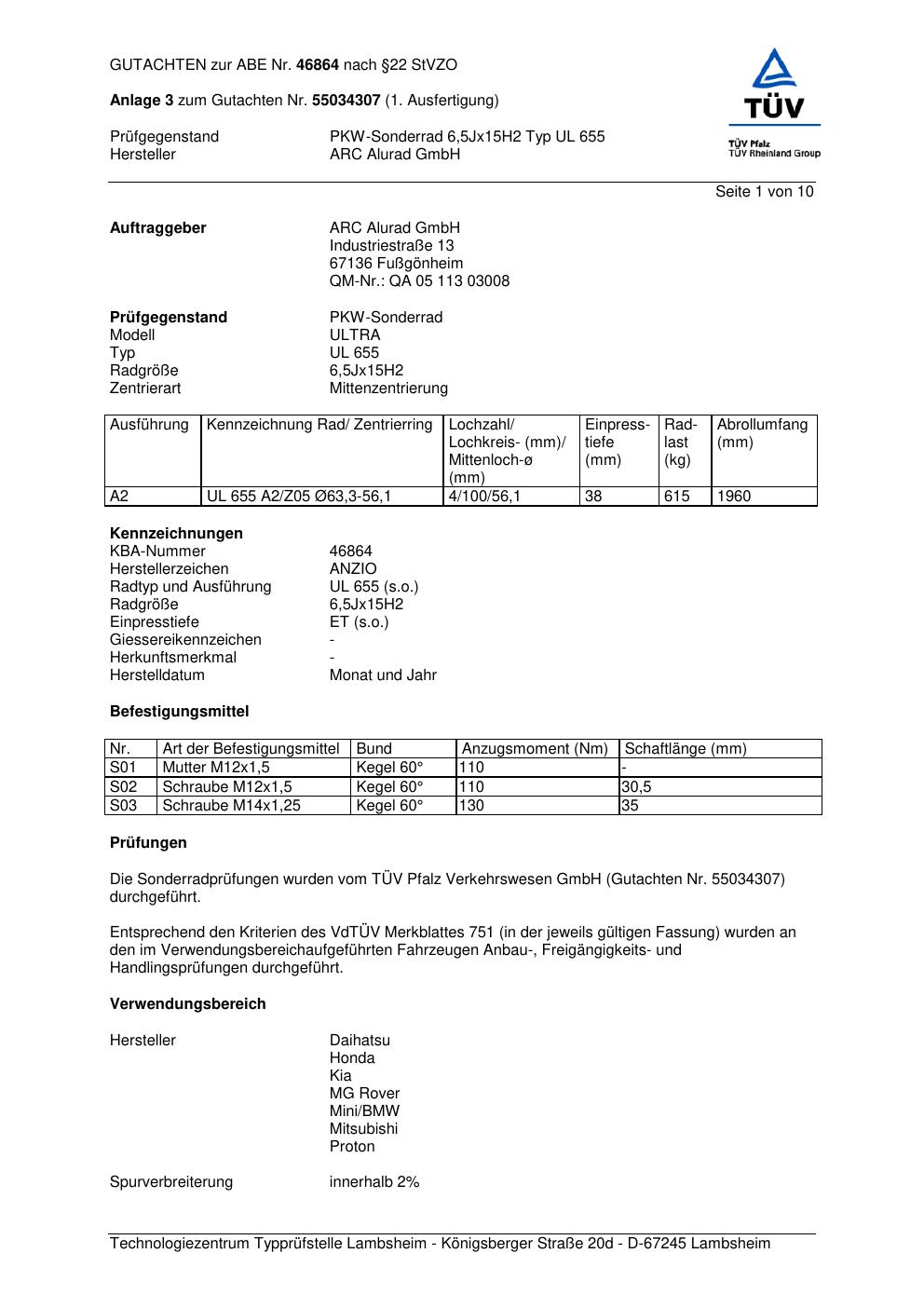 Dieses Gutachten (abe) bezieht sich auf die Alufelge Anzio UL 655 in der Ausführung 6.5Jx15 ET 0, Mittenloch 0 mm (KBA 46864). Im PDF findest du typischerweise zulässige Reifengrößen, Auflagen/Anbauhinweise und – je nach Dokument – Hinweise zur Eintragung.