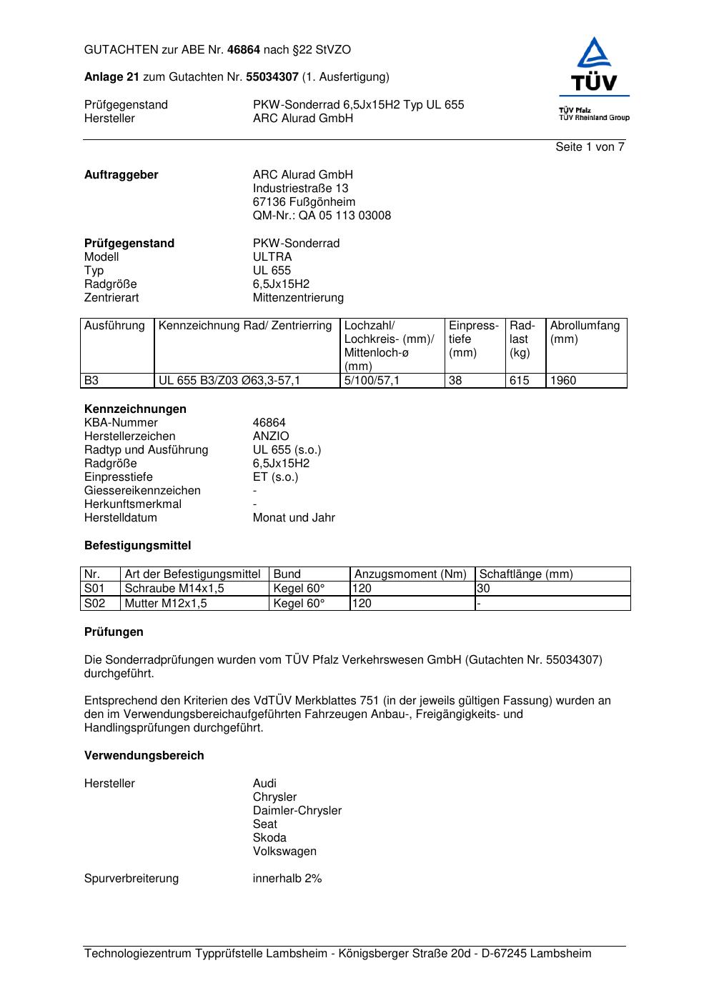 Dieses Gutachten (abe) bezieht sich auf die Alufelge Anzio UL 655 in der Ausführung 6.5Jx15 ET 0, Mittenloch 0 mm (KBA 46864). Im PDF findest du typischerweise zulässige Reifengrößen, Auflagen/Anbauhinweise und – je nach Dokument – Hinweise zur Eintragung.