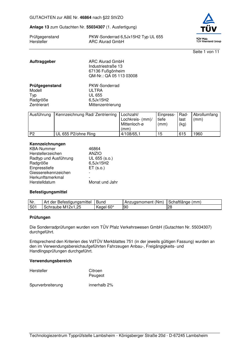 Dieses Gutachten (abe) bezieht sich auf die Alufelge Anzio UL 655 in der Ausführung 6.5Jx15 ET 0, Mittenloch 0 mm (KBA 46864). Im PDF findest du typischerweise zulässige Reifengrößen, Auflagen/Anbauhinweise und – je nach Dokument – Hinweise zur Eintragung.