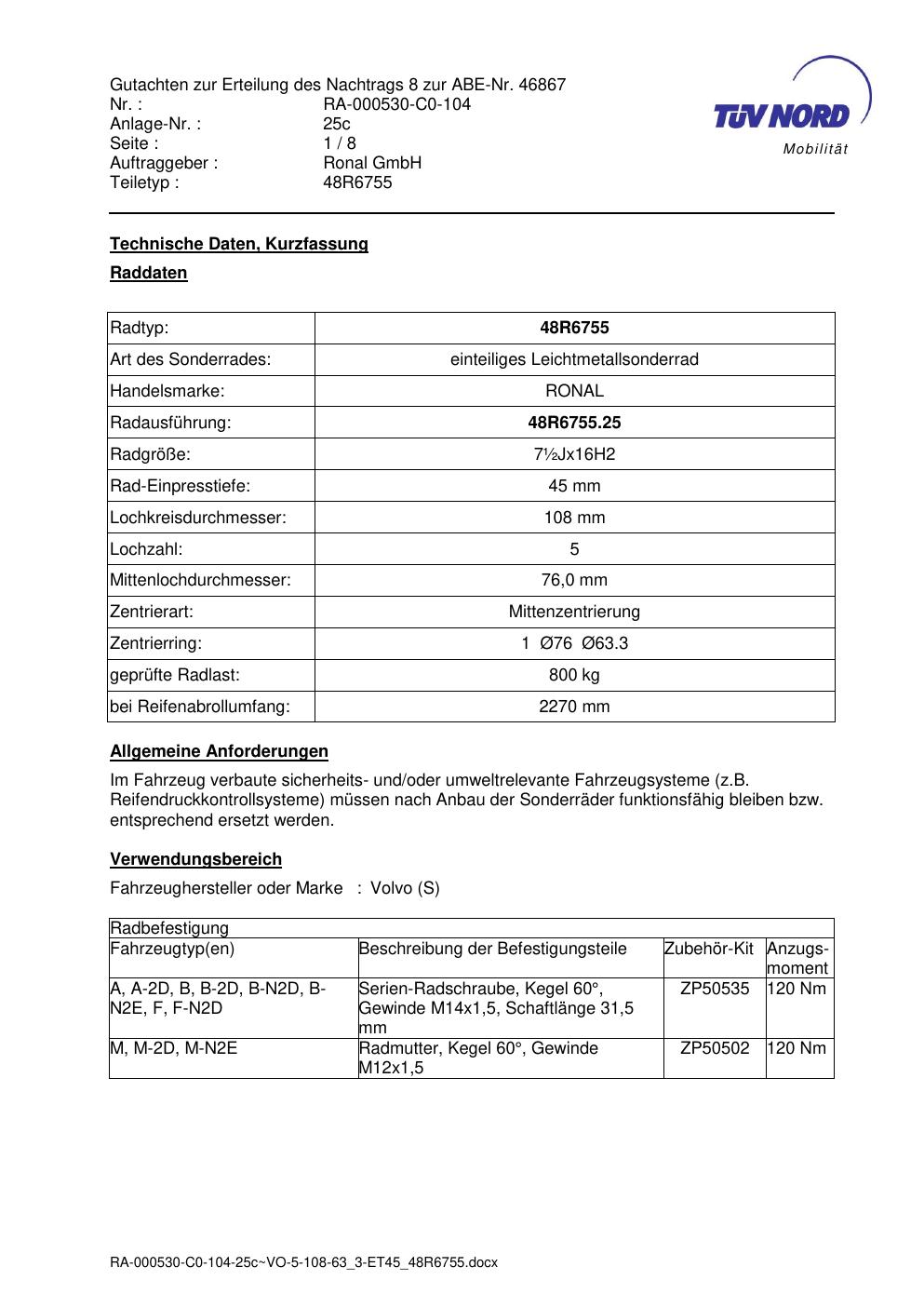 Dieses Gutachten (abe) bezieht sich auf die Alufelge brand-ronal 48R6755 in der Ausführung ET 0, Mittenloch 0 mm (KBA 46867). Im PDF findest du typischerweise zulässige Reifengrößen, Auflagen/Anbauhinweise und – je nach Dokument – Hinweise zur Eintragung.