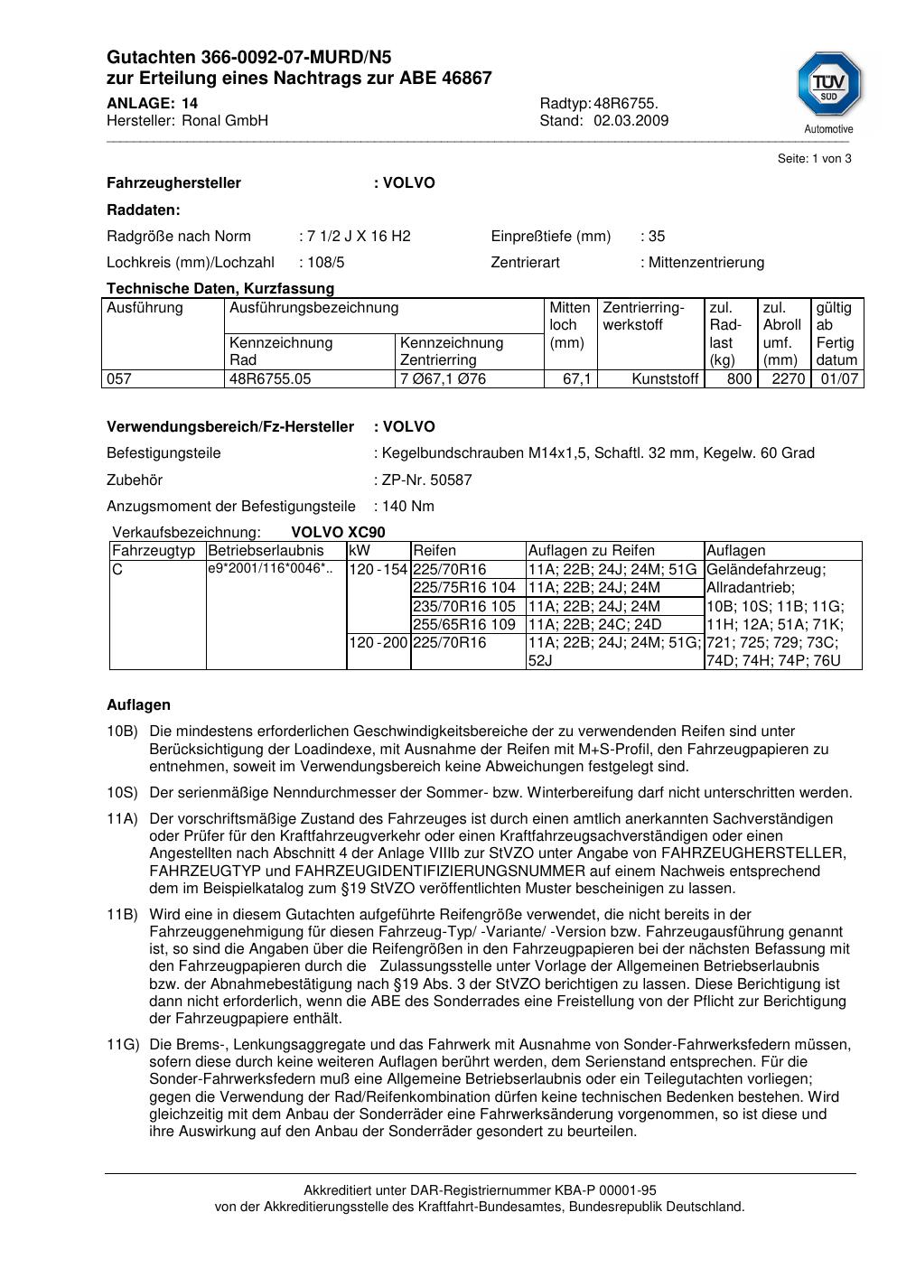 Dieses Gutachten (abe) bezieht sich auf die Alufelge Ronal 48R6755 in der Ausführung 2Jx16 ET 0, Mittenloch 0 mm (KBA 46867). Im PDF findest du typischerweise zulässige Reifengrößen, Auflagen/Anbauhinweise und – je nach Dokument – Hinweise zur Eintragung.