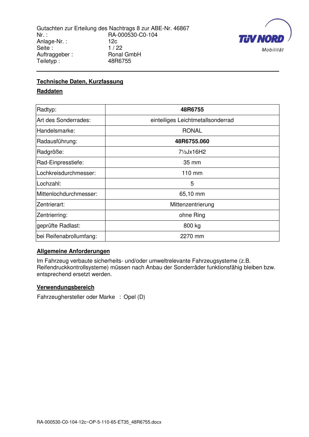 Dieses Gutachten (abe) bezieht sich auf die Alufelge brand-ronal 48R6755 in der Ausführung ET 0, Mittenloch 0 mm (KBA 46867). Im PDF findest du typischerweise zulässige Reifengrößen, Auflagen/Anbauhinweise und – je nach Dokument – Hinweise zur Eintragung.