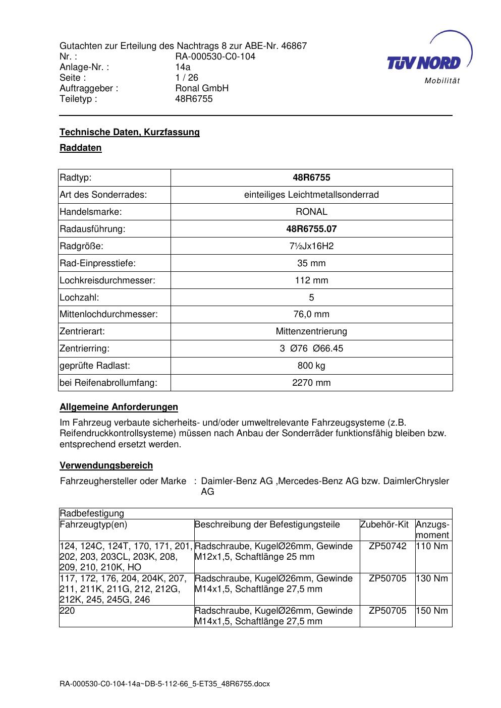 Dieses Gutachten (abe) bezieht sich auf die Alufelge brand-ronal 48R6755 in der Ausführung ET 0, Mittenloch 0 mm (KBA 46867). Im PDF findest du typischerweise zulässige Reifengrößen, Auflagen/Anbauhinweise und – je nach Dokument – Hinweise zur Eintragung.