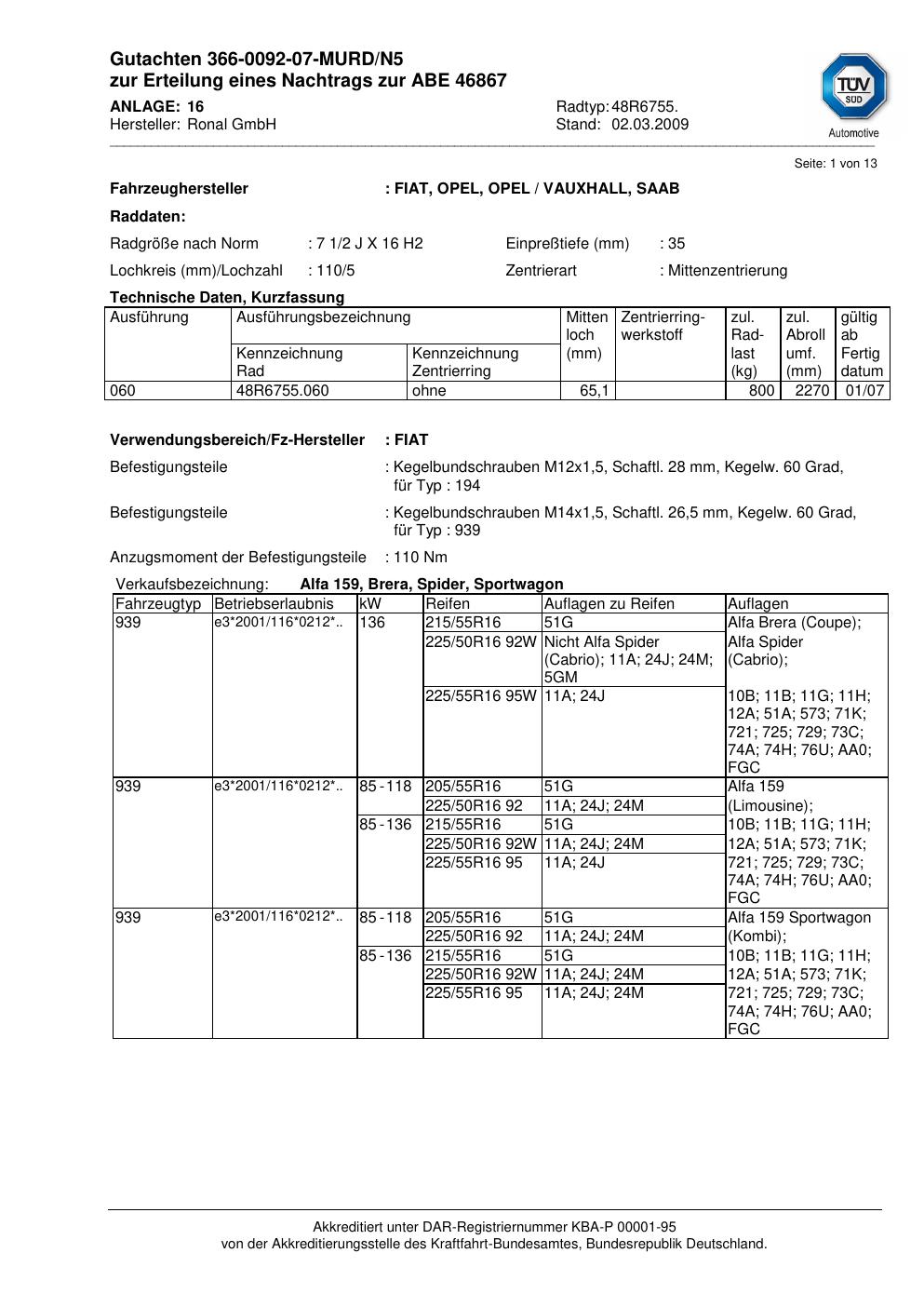 Dieses Gutachten (abe) bezieht sich auf die Alufelge Ronal 48R6755 in der Ausführung 2Jx16 ET 0, Mittenloch 0 mm (KBA 46867). Im PDF findest du typischerweise zulässige Reifengrößen, Auflagen/Anbauhinweise und – je nach Dokument – Hinweise zur Eintragung.